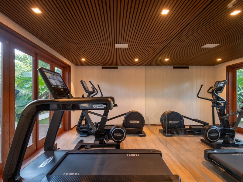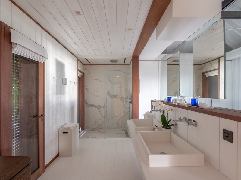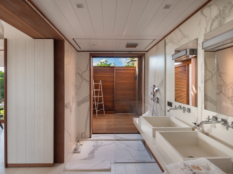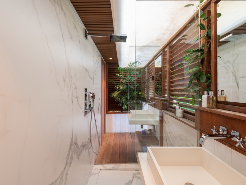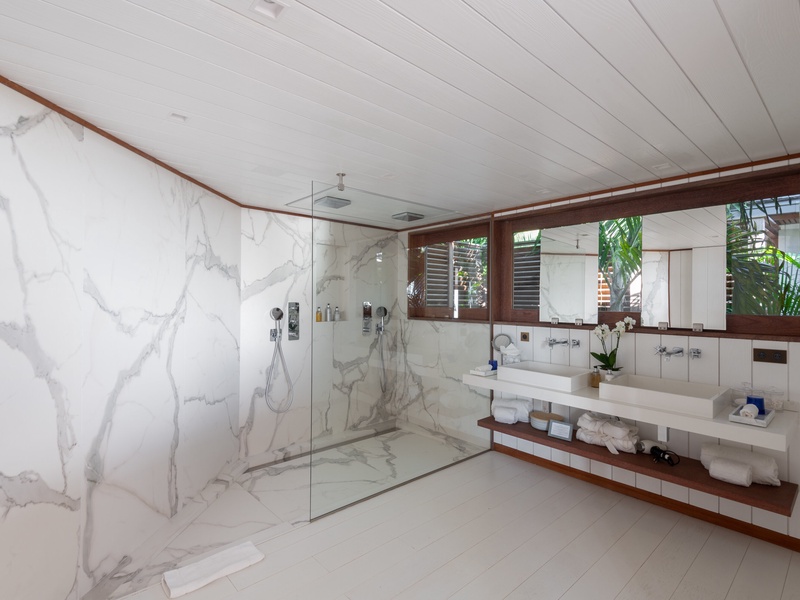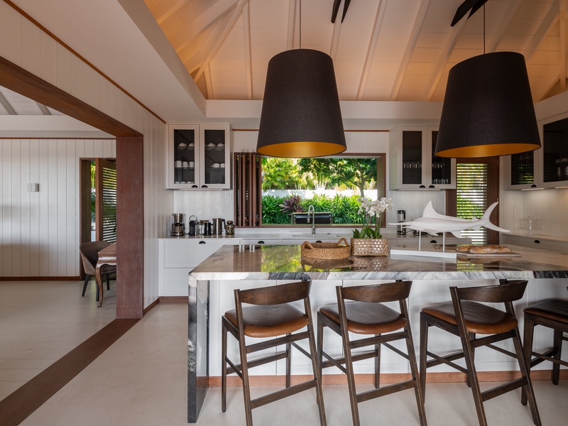 The main level of this luxury villa consists of an air-conditioned living room, and a fully-equipped kitchen with a beautiful marble breakfast island.