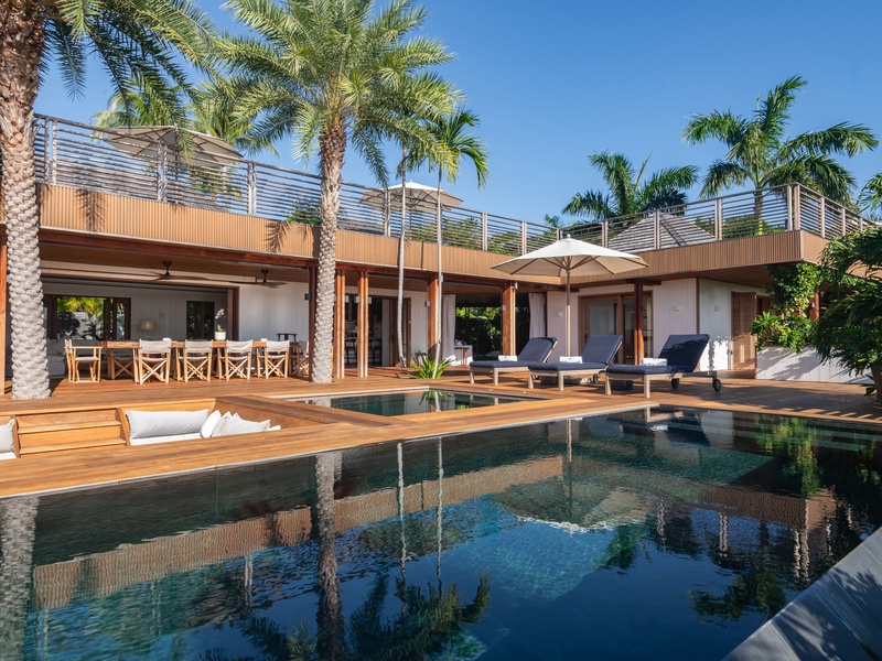 A long terrace runs along the villa’s front, with a beautiful wooden deck and seating areas. The long, heated pool overl...