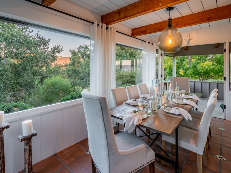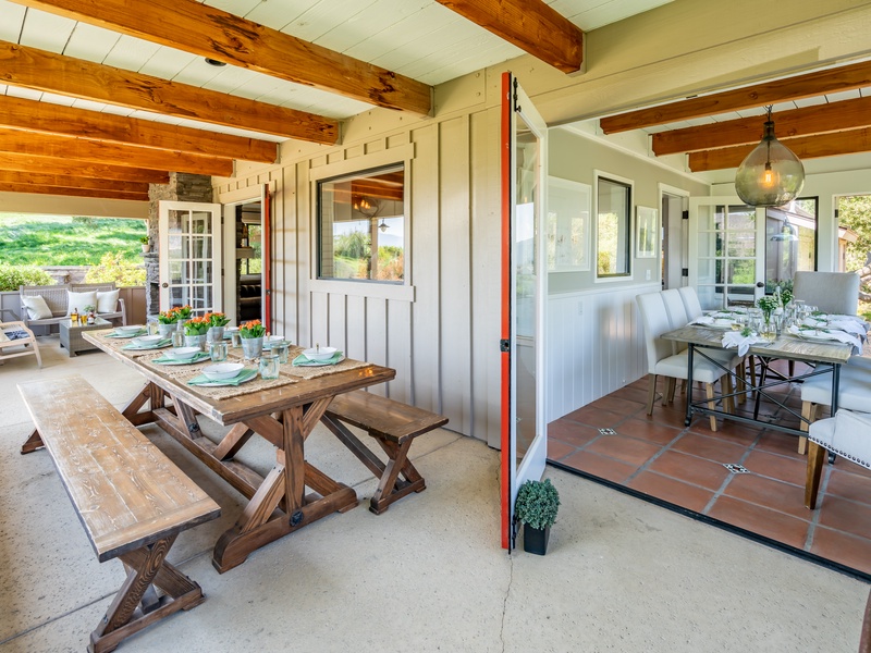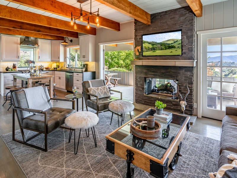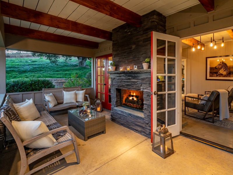 The fully remodeled home showcases high wood-beamed ceilings, an enclosed outdoor Dining Area, a two-sided fireplace in the Living...