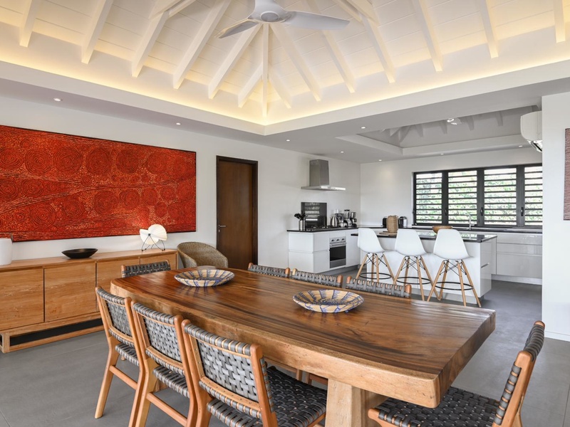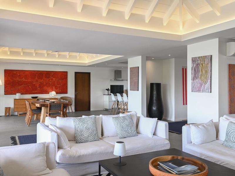 The interiors of Villa Cairn are understated and elegant. Clean white walls and vaulted ceilings combine to create a space that’s rich in natural light, with high-end furnishings providing the comforts of home. Tasteful Aborig...