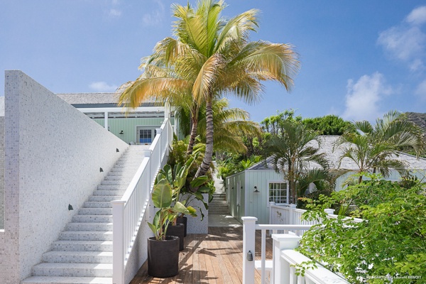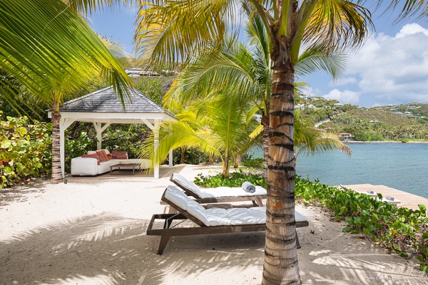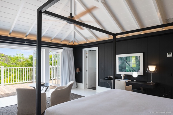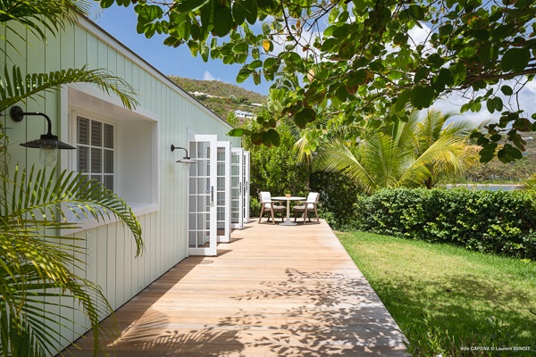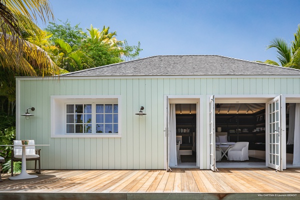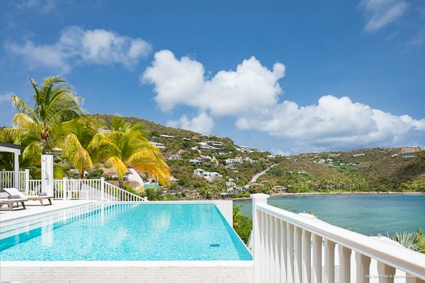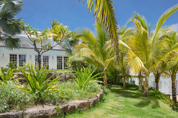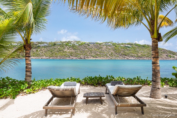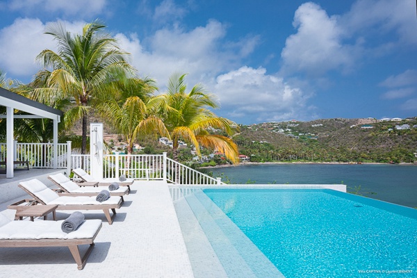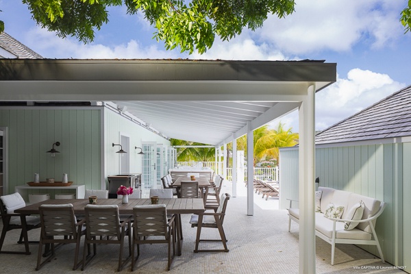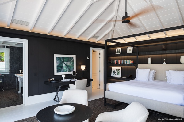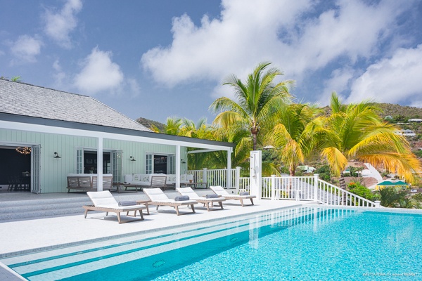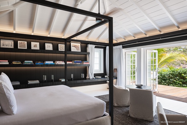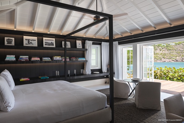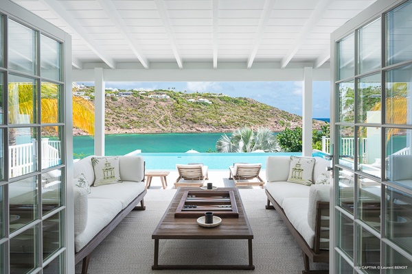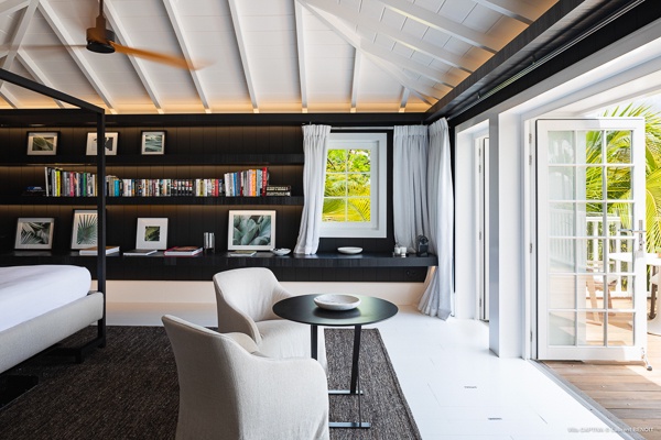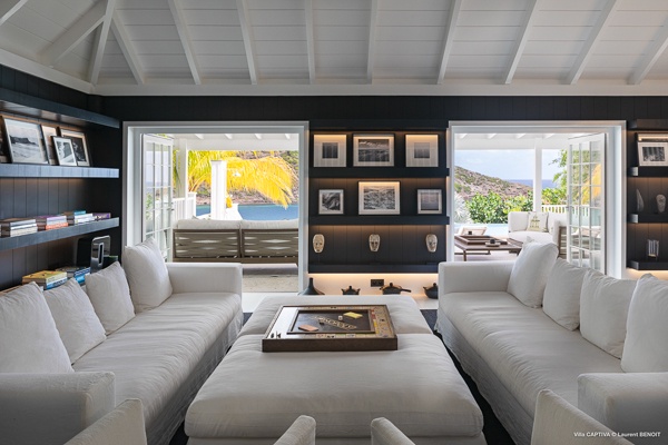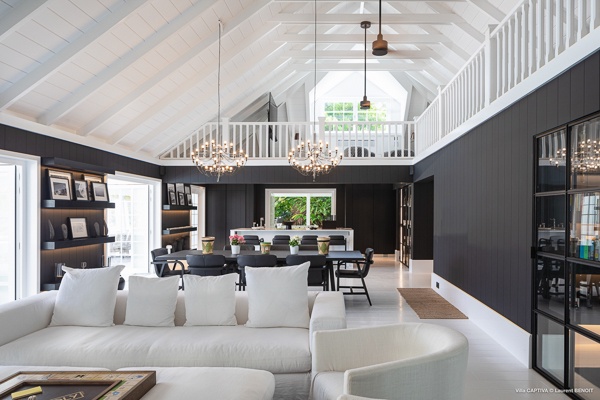 This newly-built villa spread out over several pavilions, marries classic Caribbean charm with top-of-the-line furnishings. An open floor-plan kitchen and living room lend an airy feel to the communal space. White wood floors paired with Belgian-linen slip-colored sofas offset otherwise modern lines and black bookshelves, creating a ...