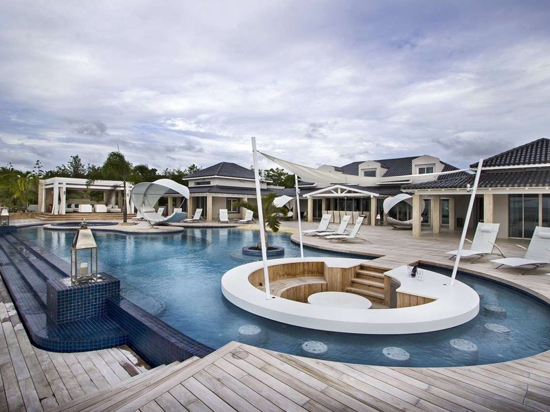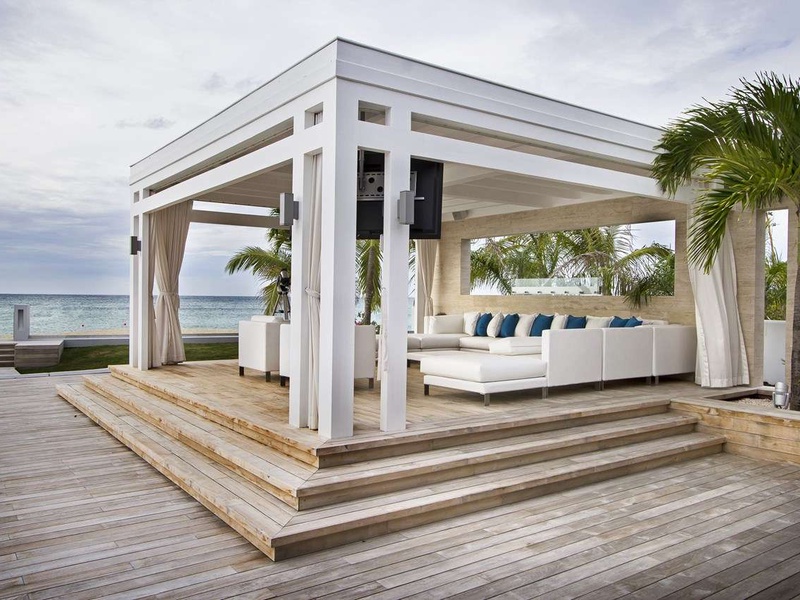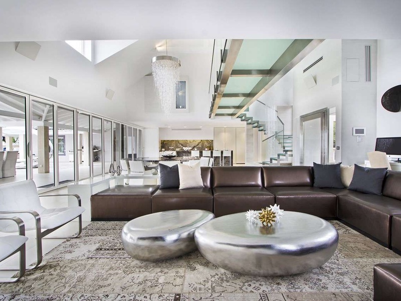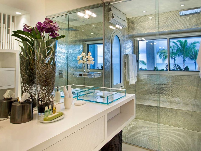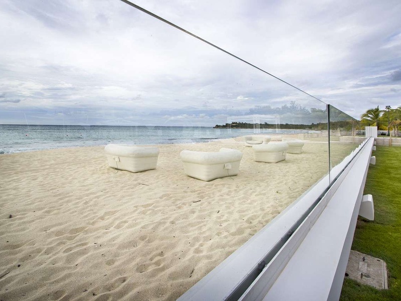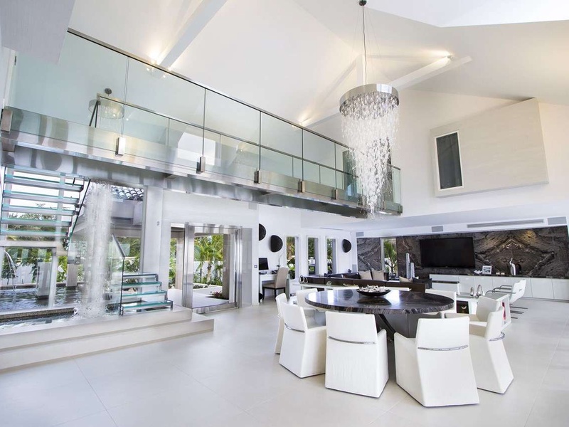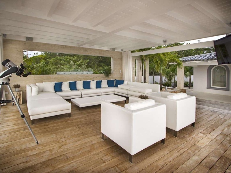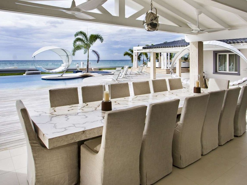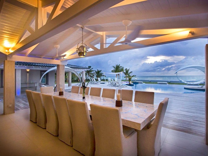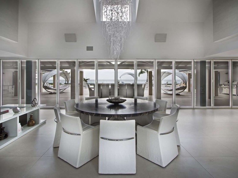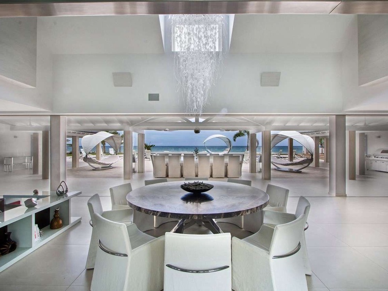 The spacious living area has central cooling, sectional sofas, and opens to the terrace and sea view. The great room comprises an indoor dining area with a table underneath a dramatic chandelier. A second dining area with seating for 14 guests is located underneath the covered...