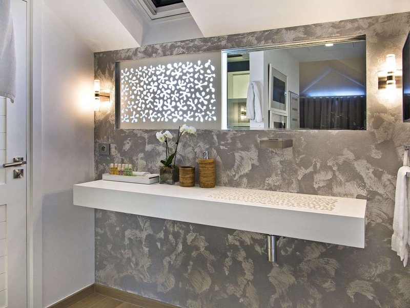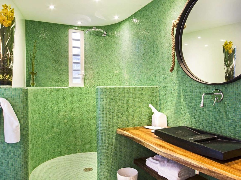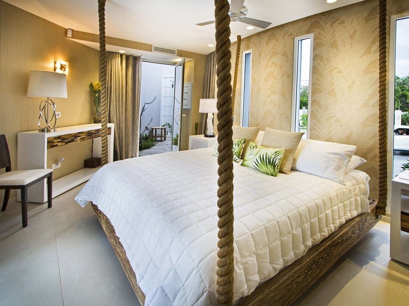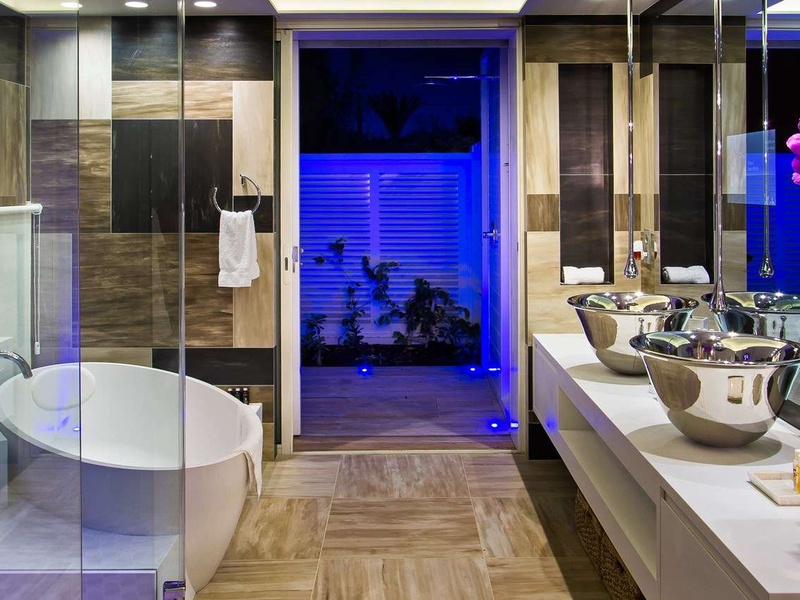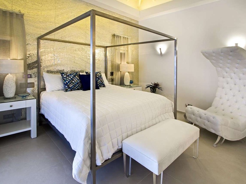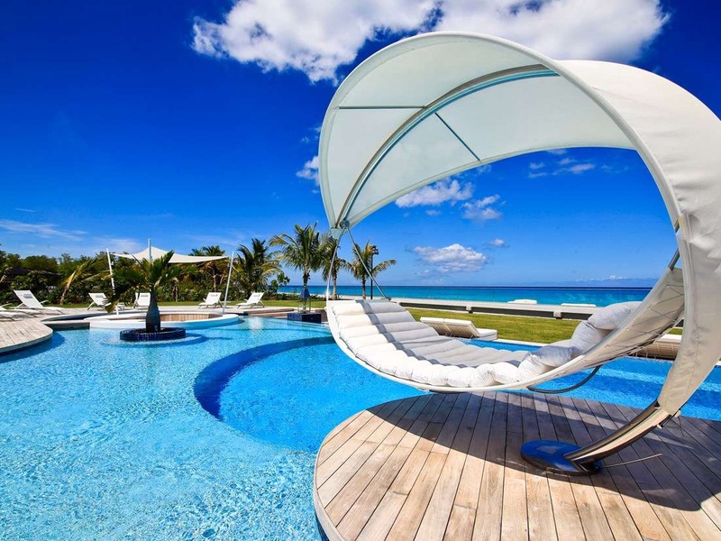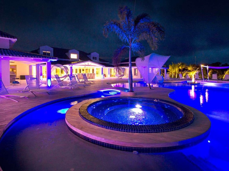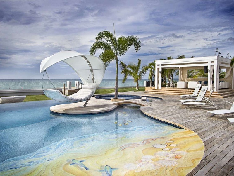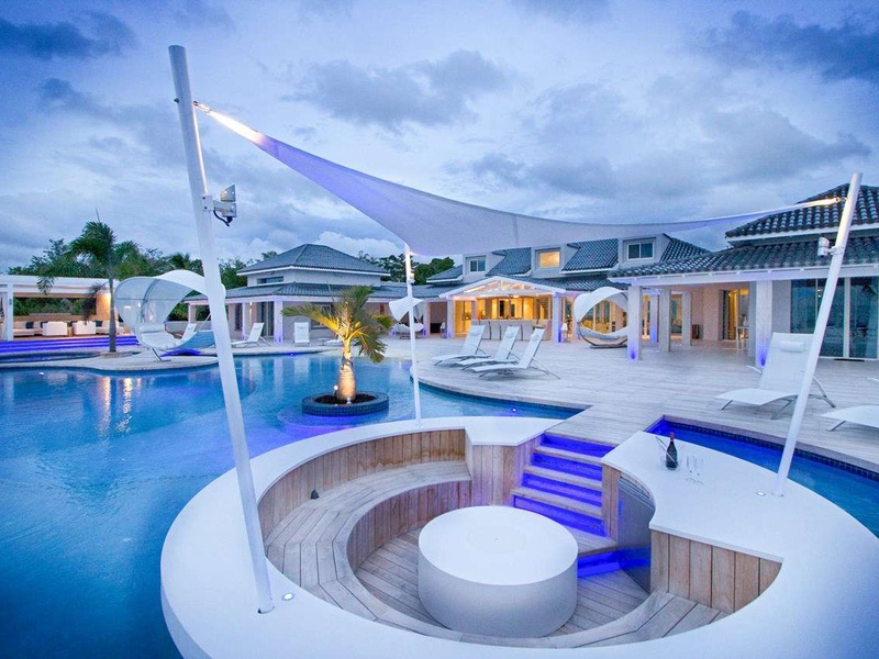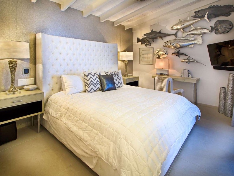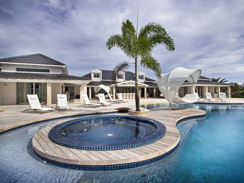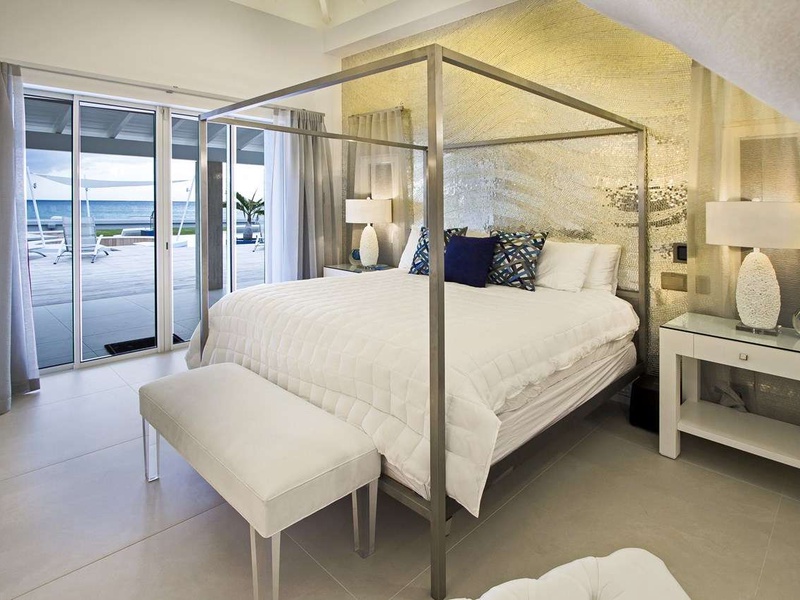The spacious living area has central cooling, sectional sofas, and opens to the terrace and sea view. The great room comprises an indoor dining area with a table underneath a dramatic chandelier. A second dining area with seating for 14 guests is located underneath the covered...