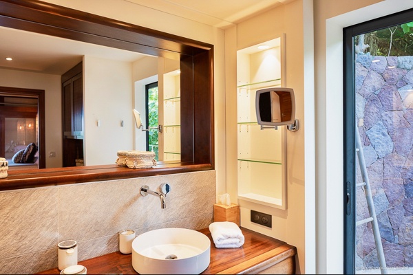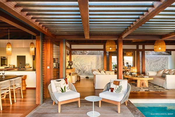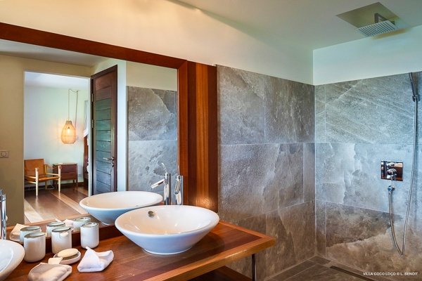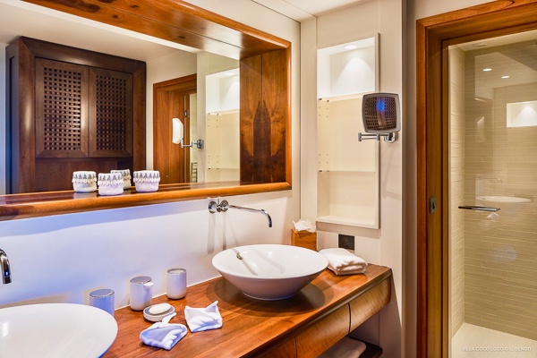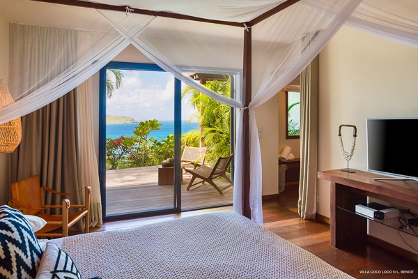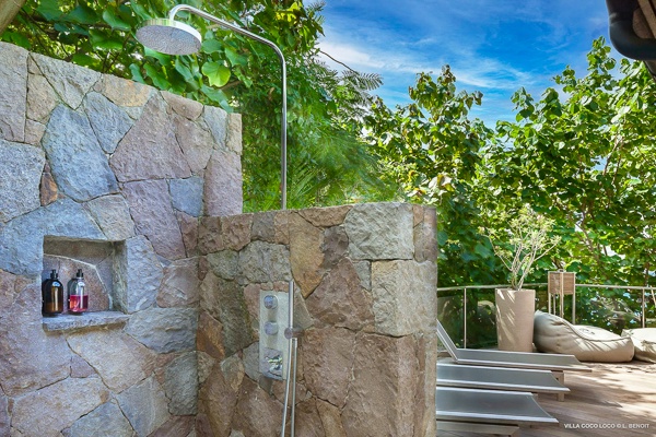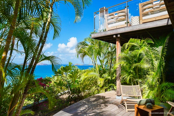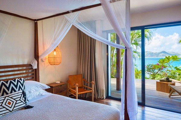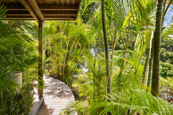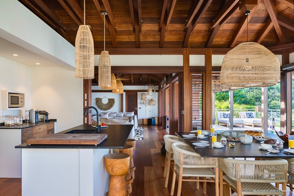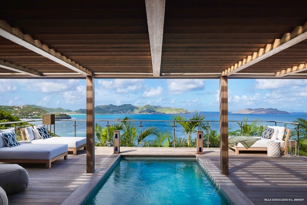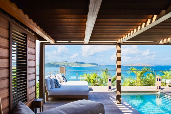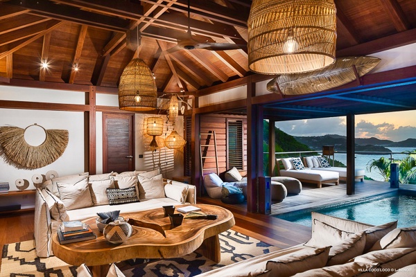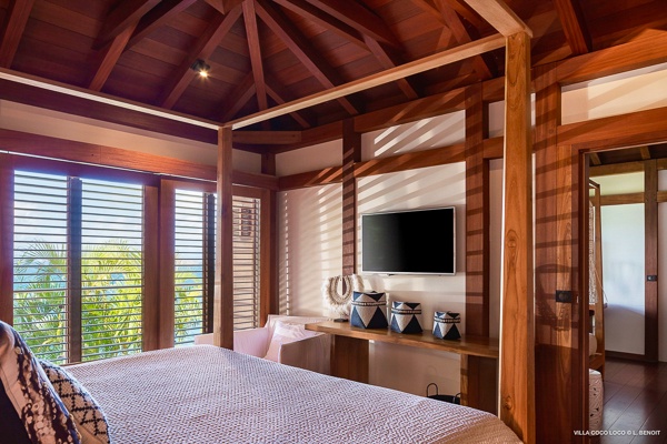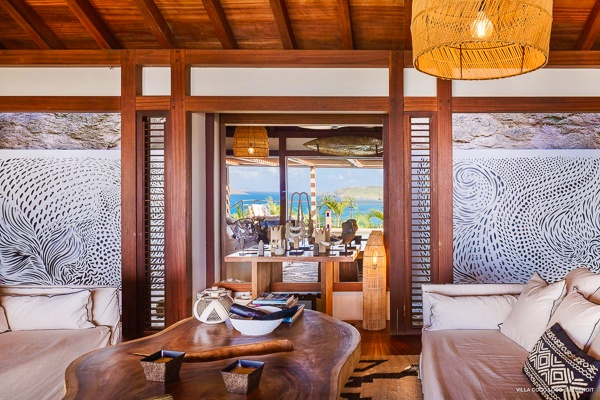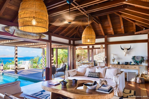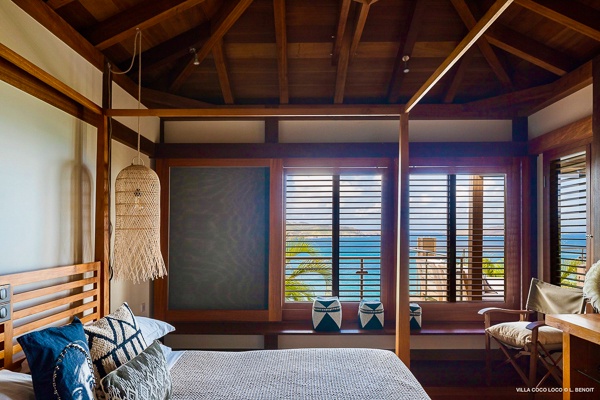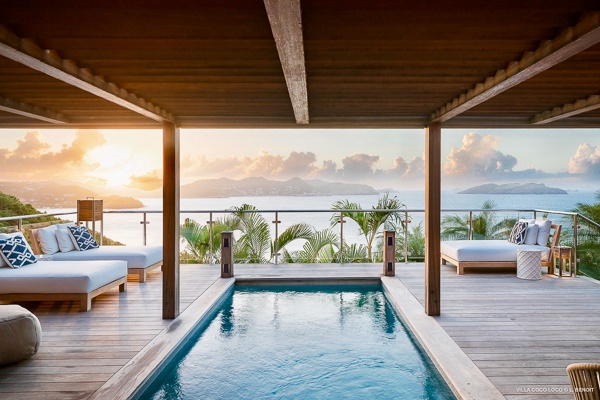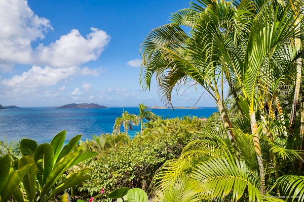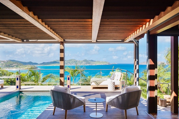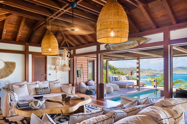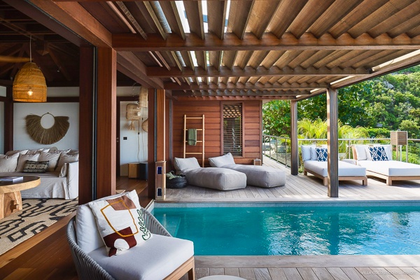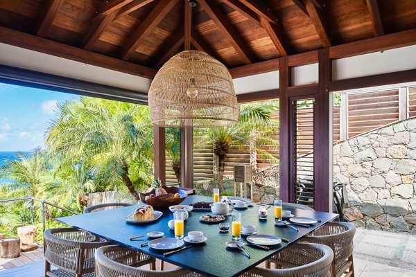 This striking Balinese-style villa, with its 4 master suites, is poised just above Pointe Milou’s 5 star Christopher Hotel. In short, a coveted location offering a 180 degree of St. Jean Bay and the ocean beyond. Configured over two levels, its lush tropical landscaping provides a sense of privacy and tranquility. The spacious open floor plan encompasses a well-equipped kitchen, a dining area, and a living room that opens to the pool deck. The heated pool is literally steps from the living room ...