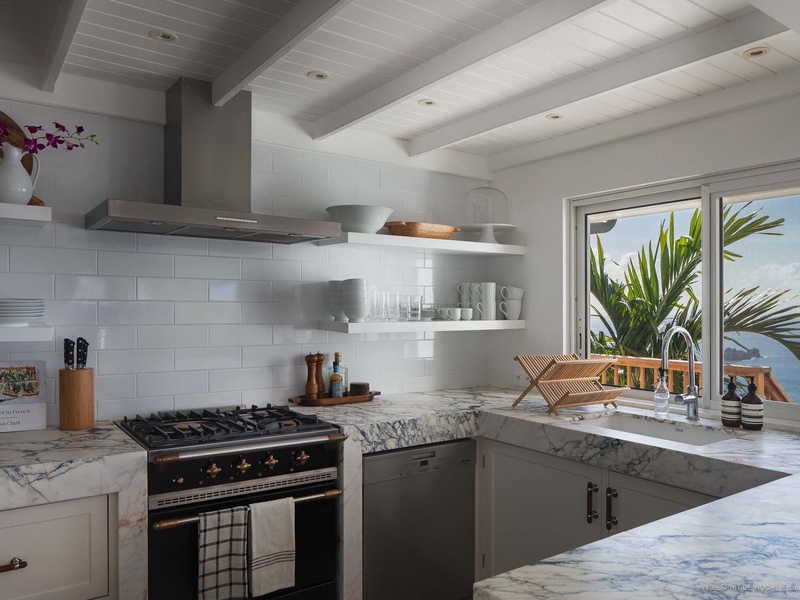Totally renovated, and beautifully decorated, the villa’s main level encompasses a living room, kitchen with a breakfast bar, and a covered dining terrace, all with a stunning view of the sea.