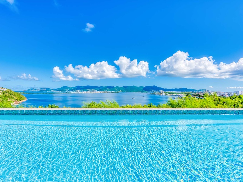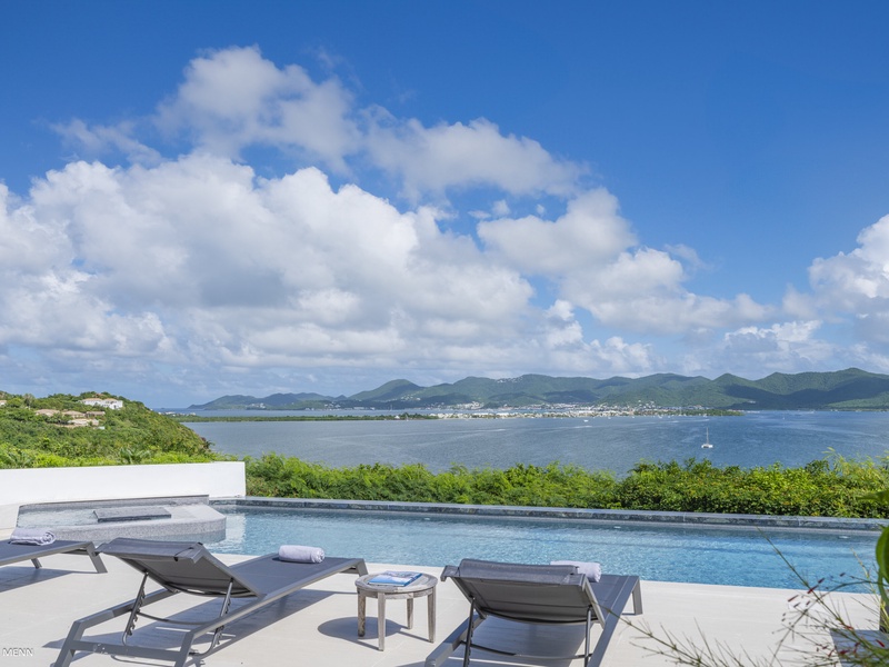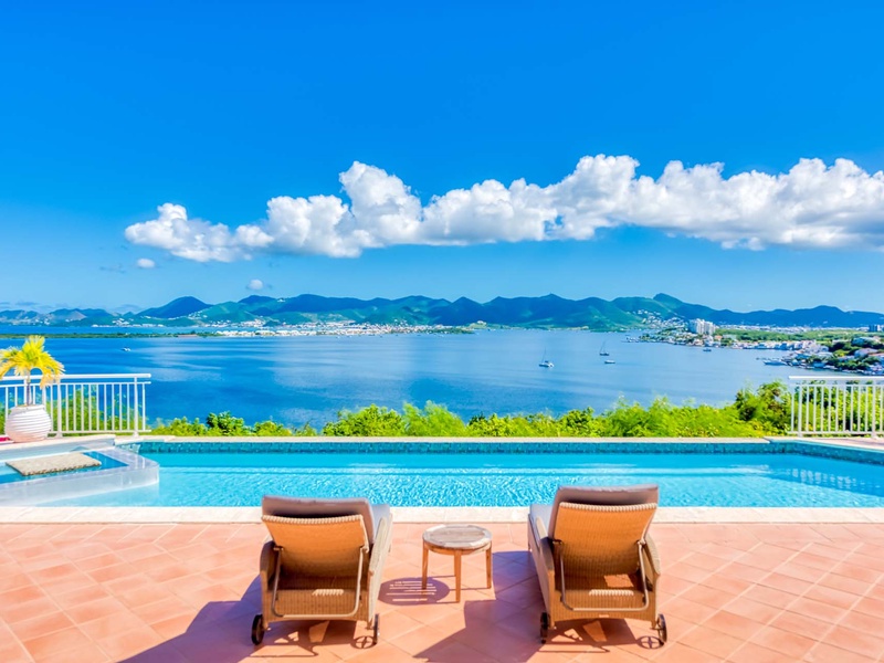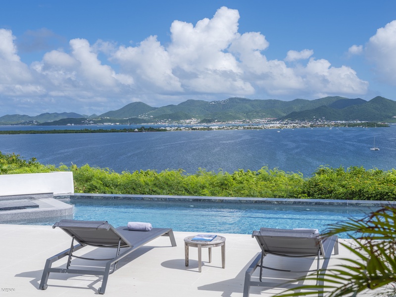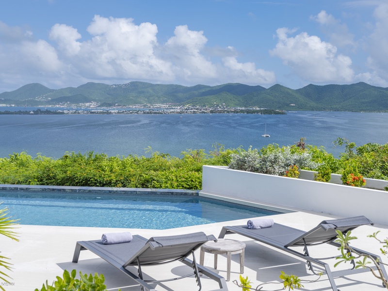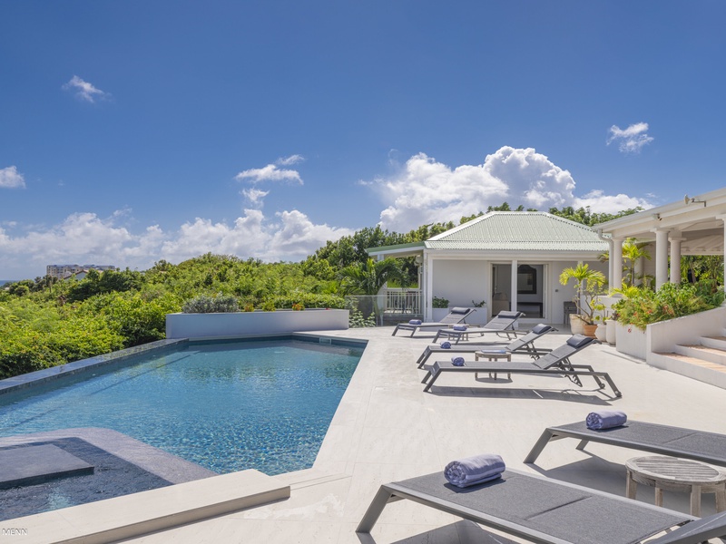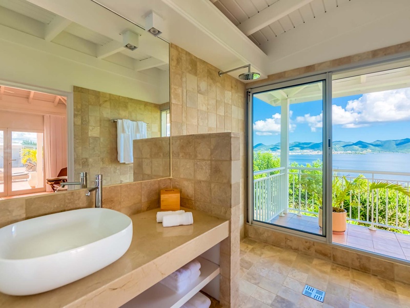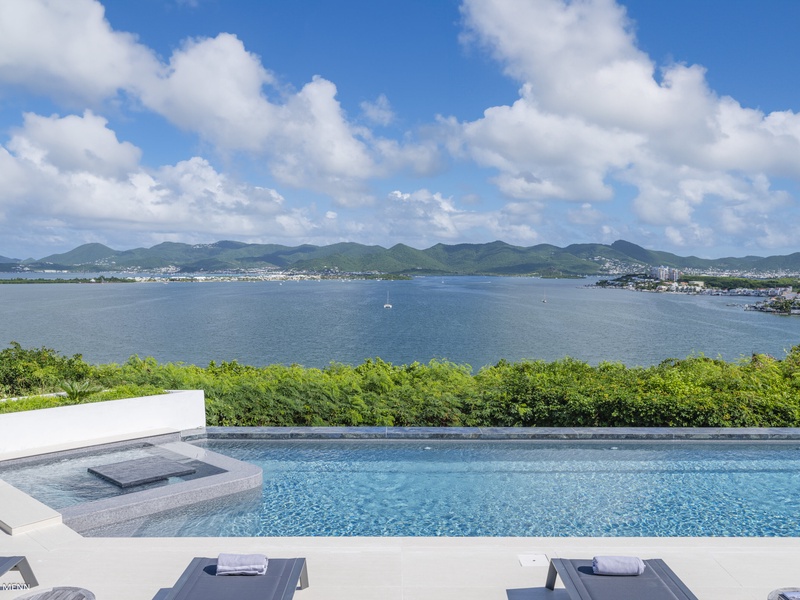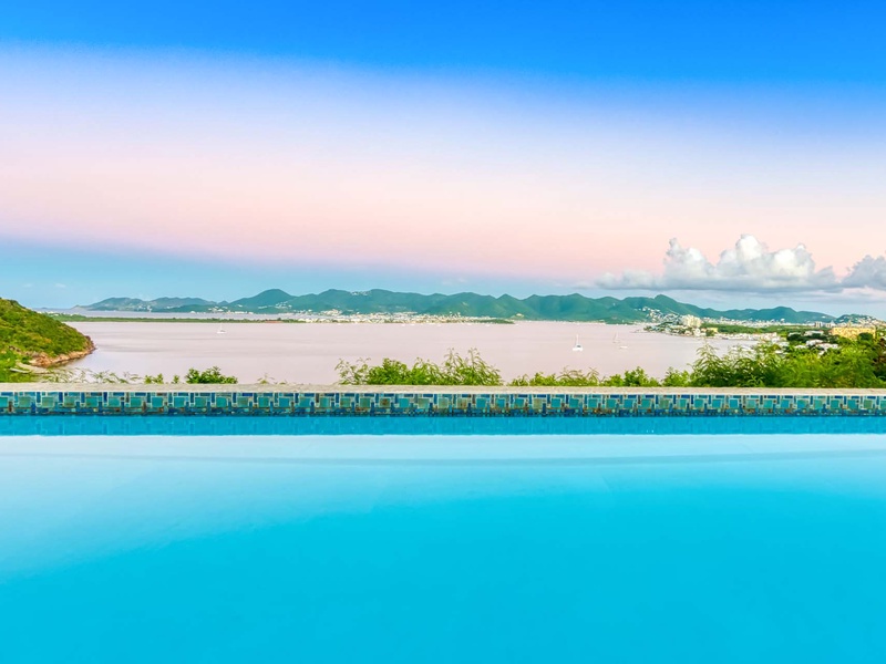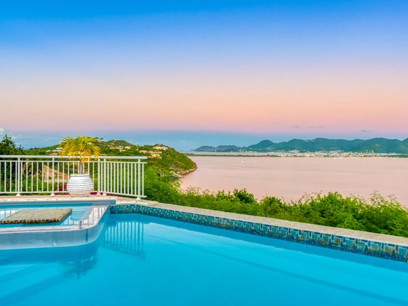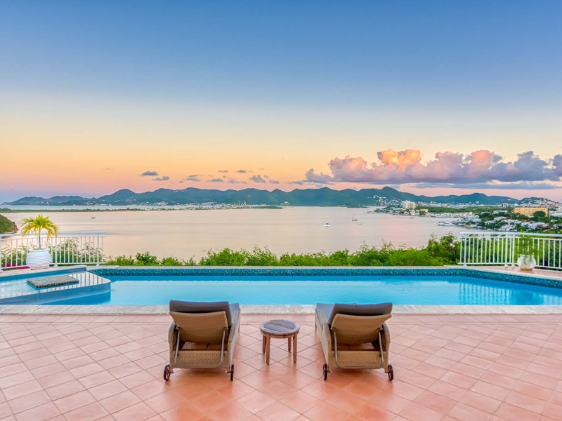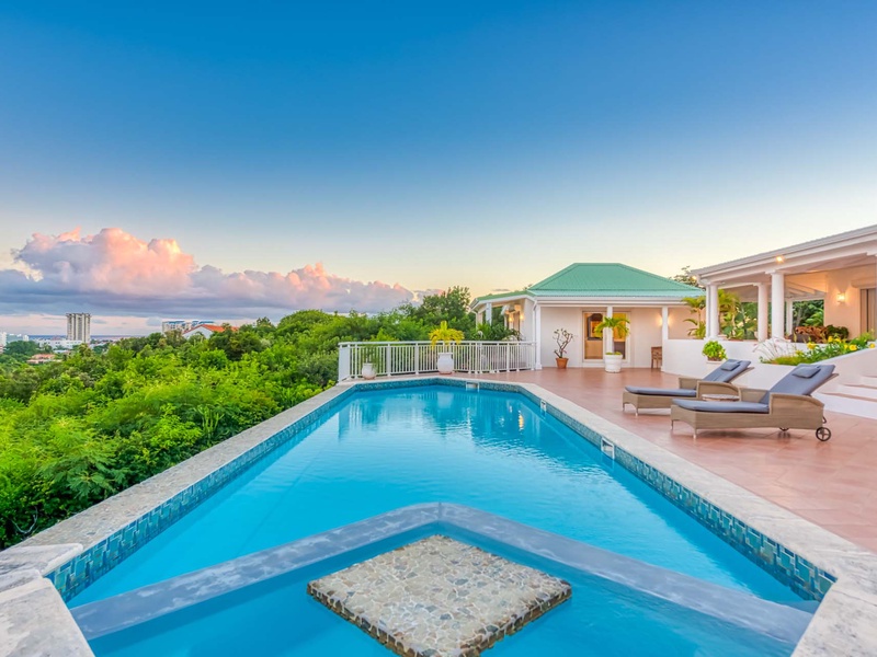 Surrounded by lush, tropical gardens, this villa enjoys spectacular sunrises, and mesmerizing views of Simpson Bay and the ocean.