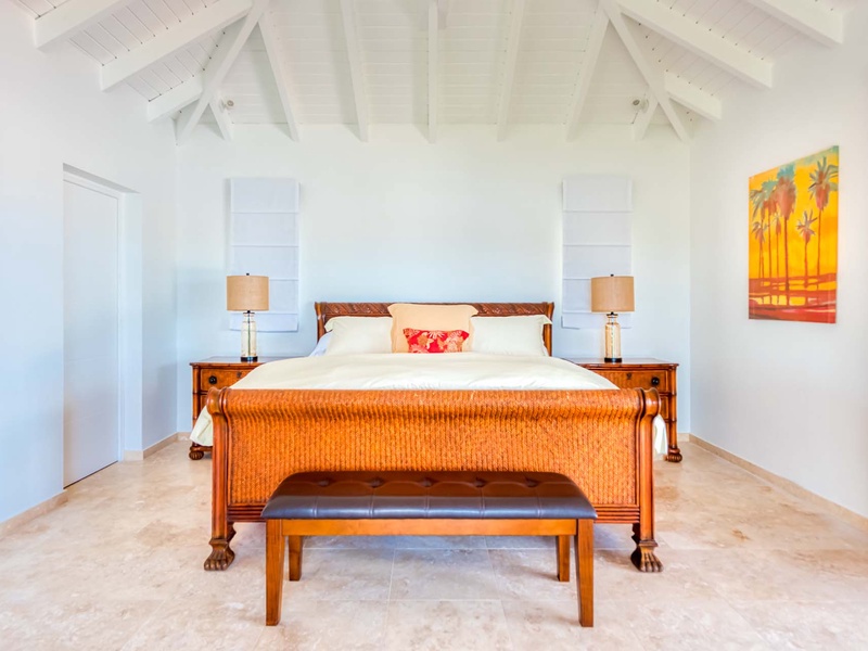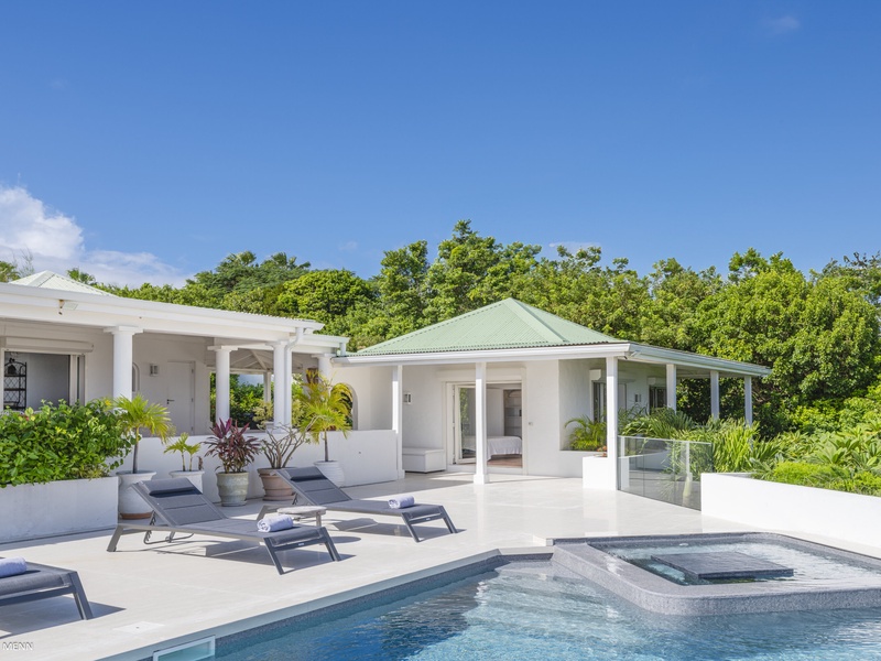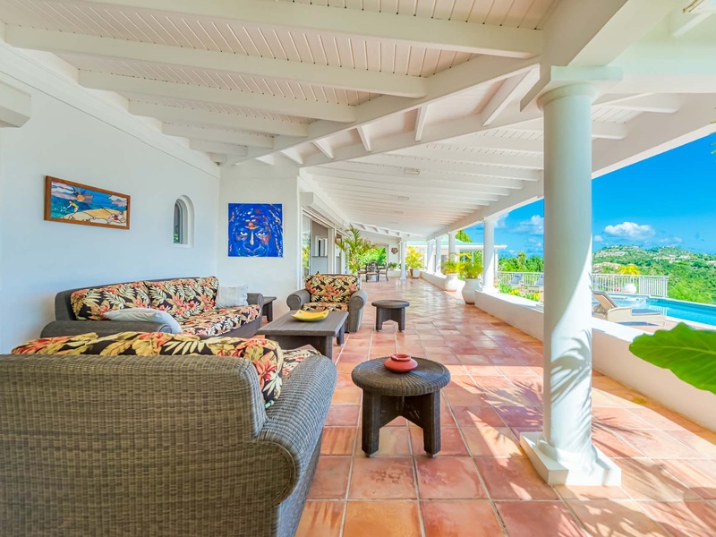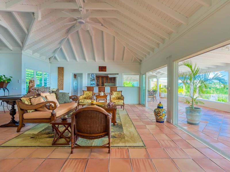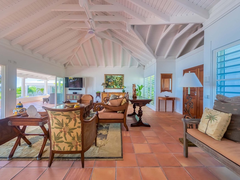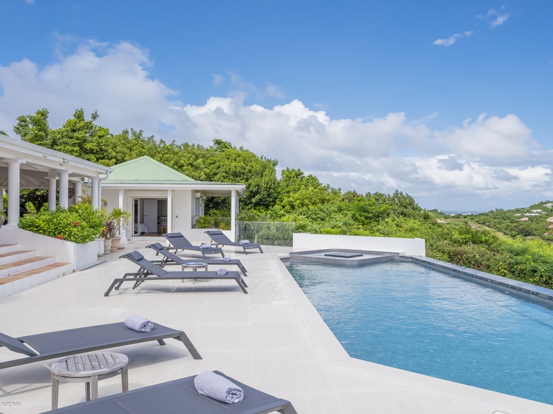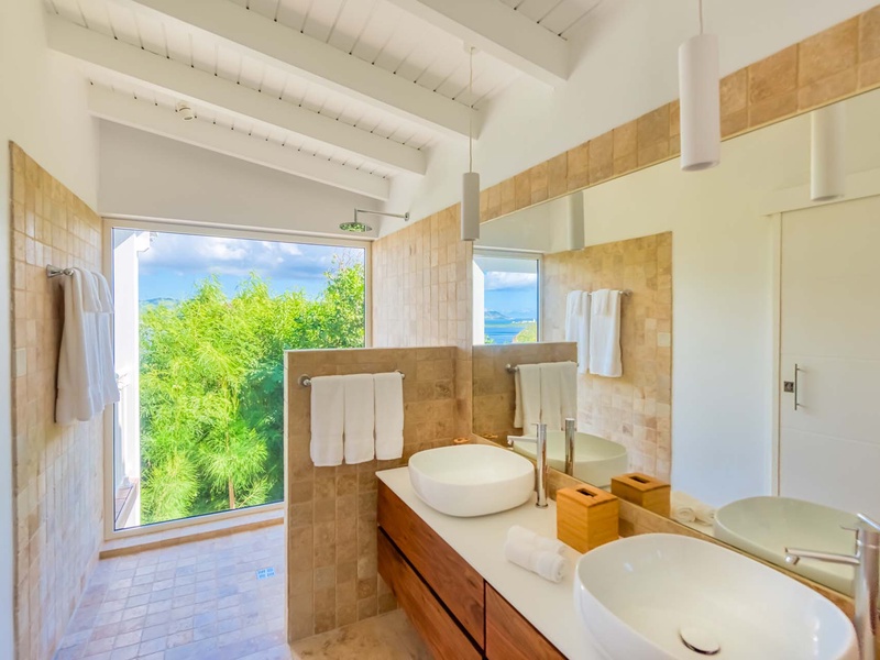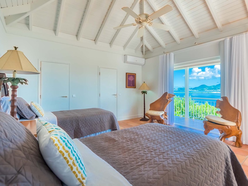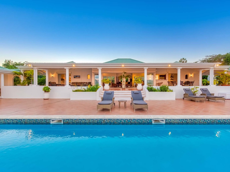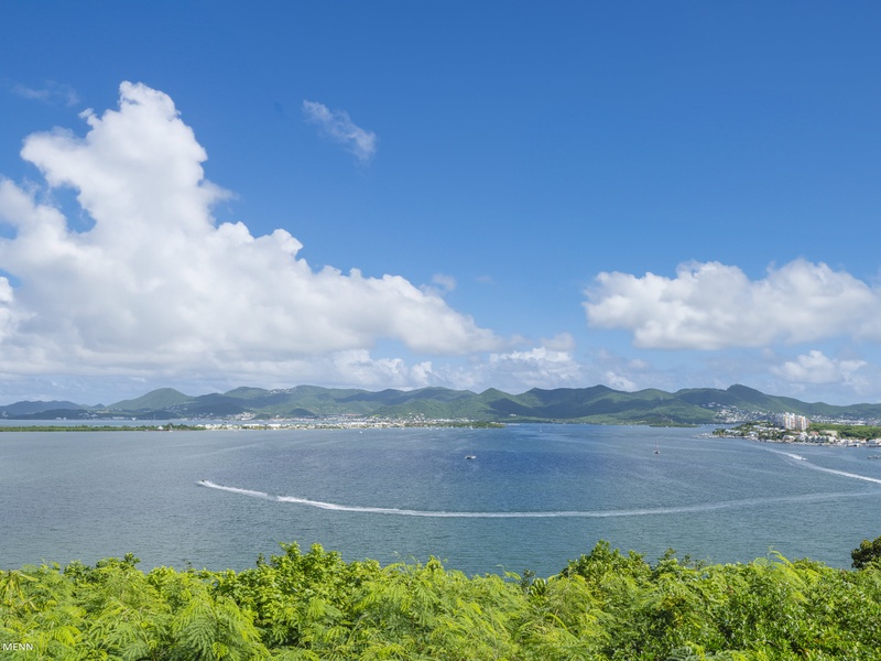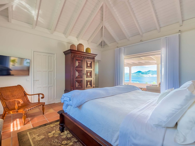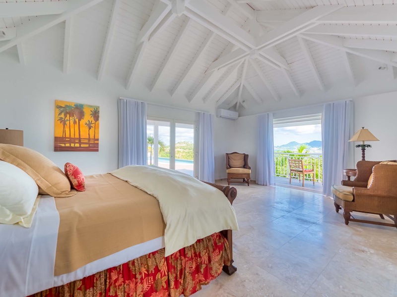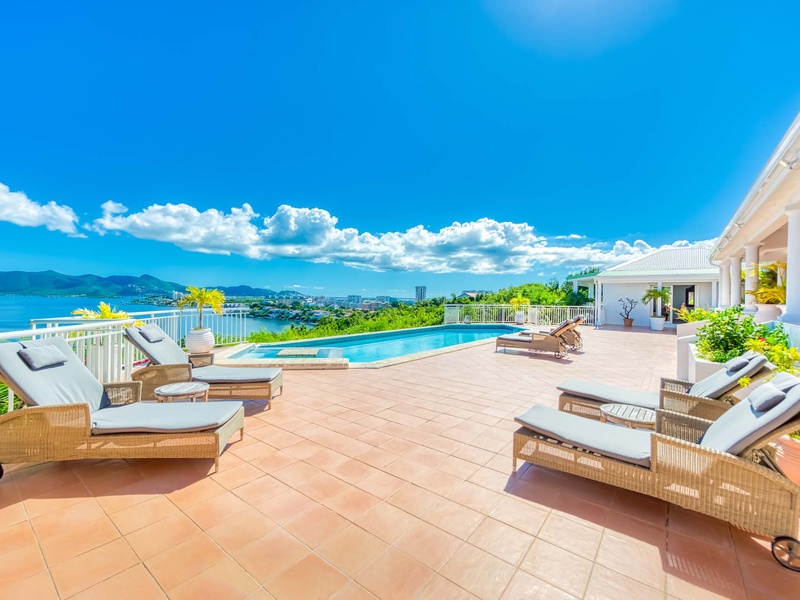 Surrounded by lush, tropical gardens, this villa enjoys spectacular sunrises, and mesmerizing views of Simpson Bay and the ocean.