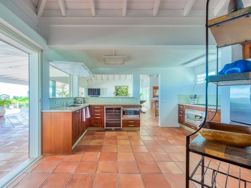 Both the indoor and outdoor lounge areas feature comfortable sitting areas. Located outside the well-equipped kitchen is a teak dining...