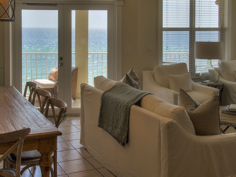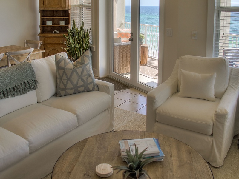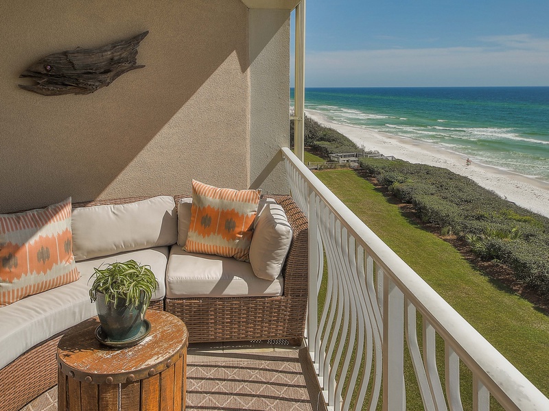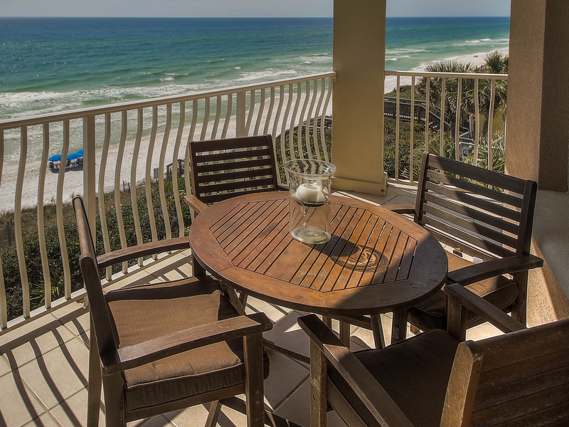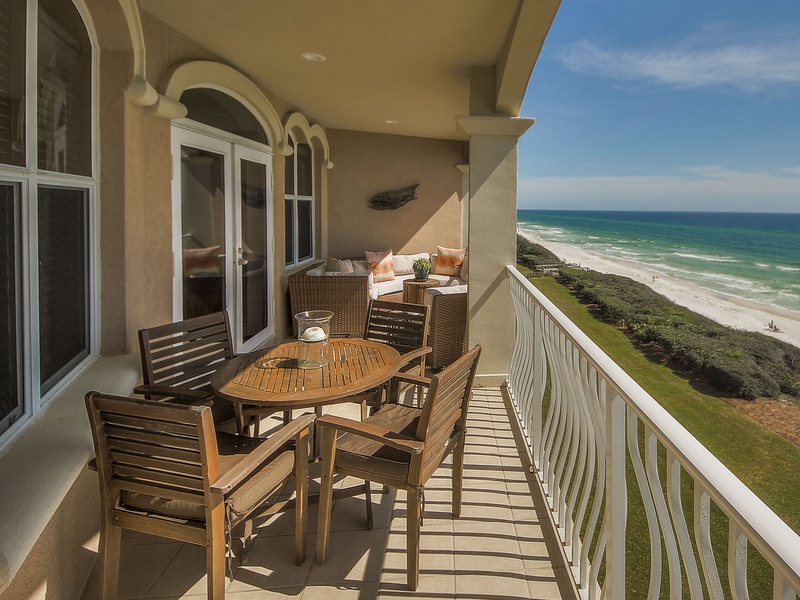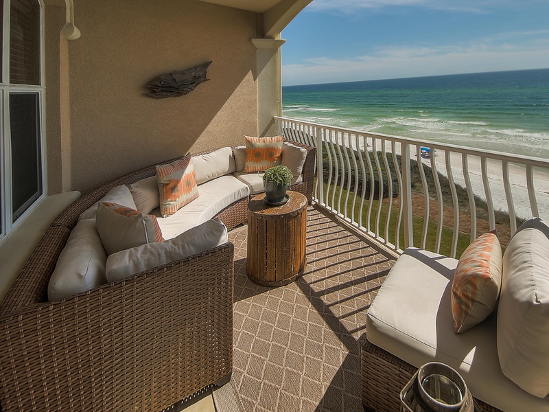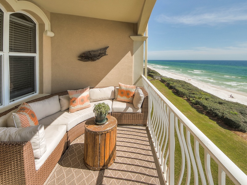 - Gulf facing balcony with cushioned seating and outdoor dining