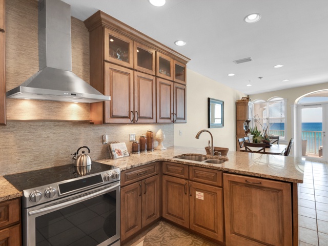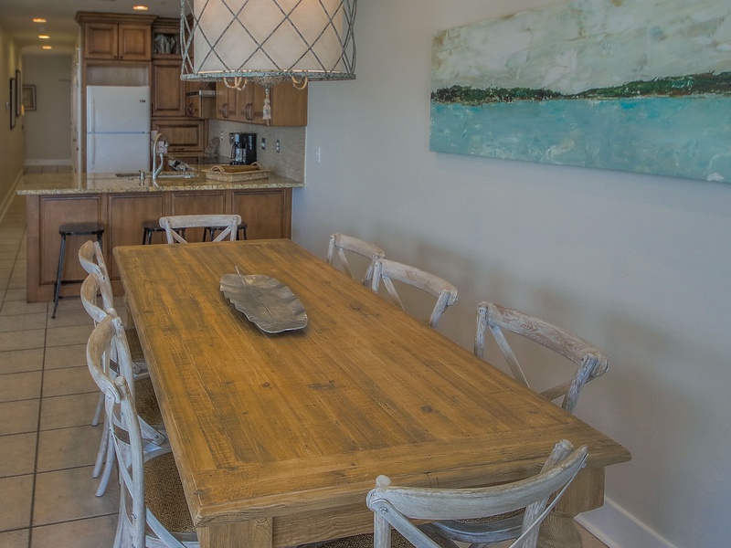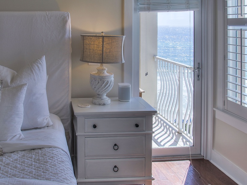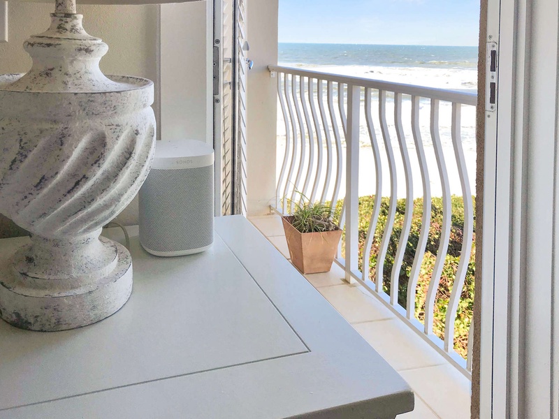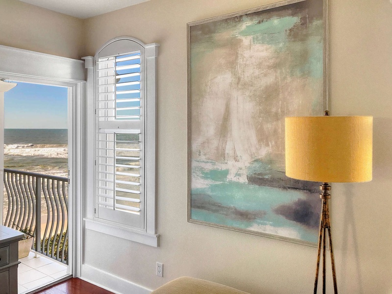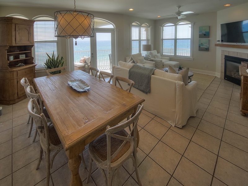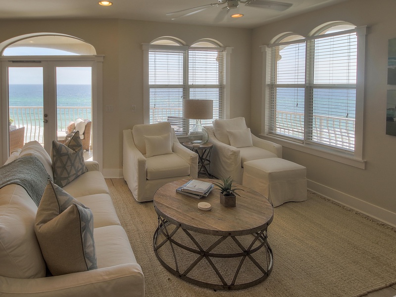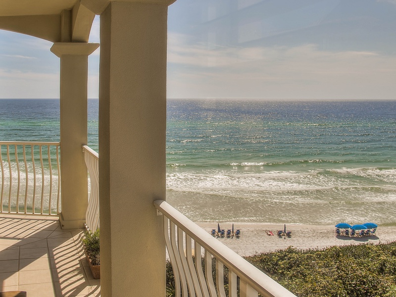 - Gulf facing balcony with cushioned seating and outdoor dining