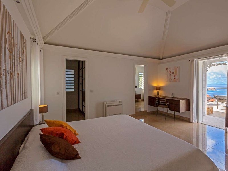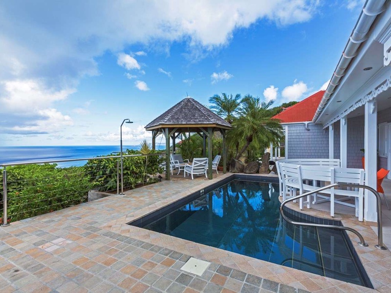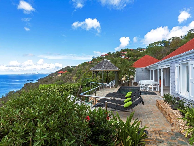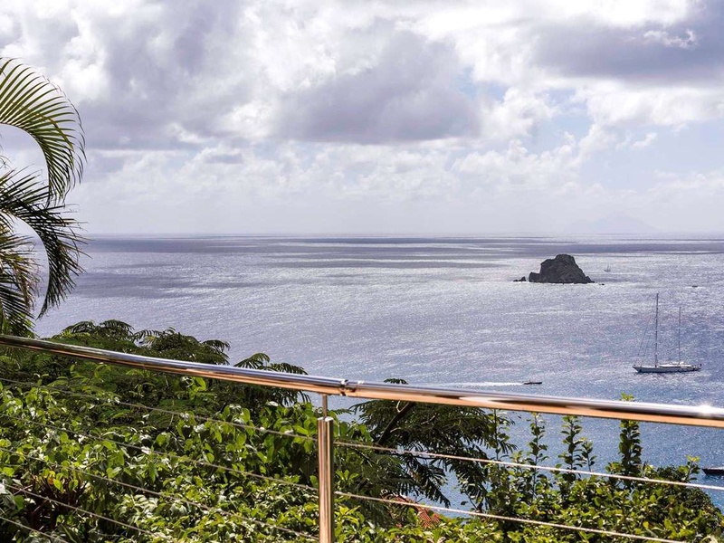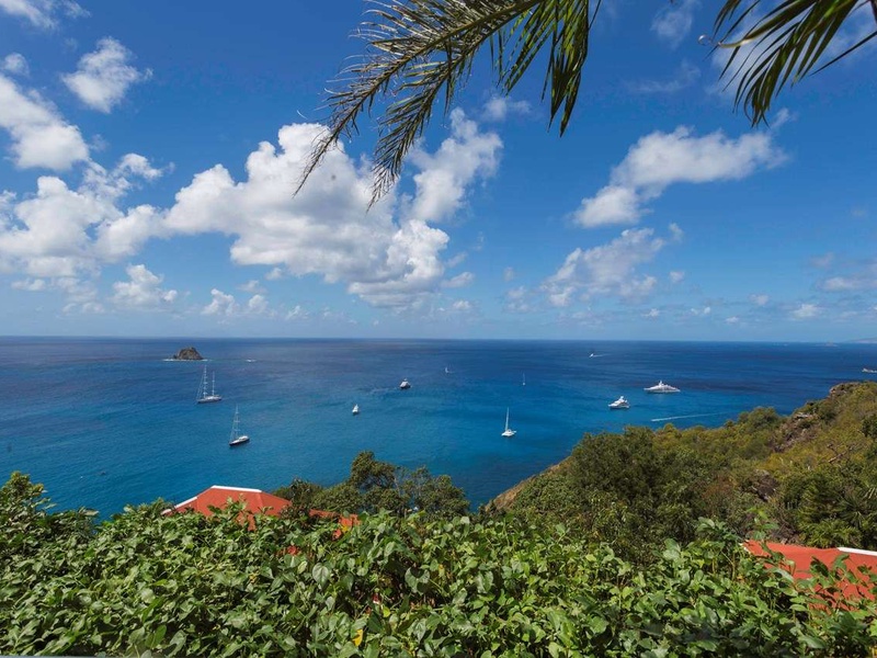 From its lofty locale, Villa Grain De Folie enjoys stunning views over the outer harbor of Gustavia and...