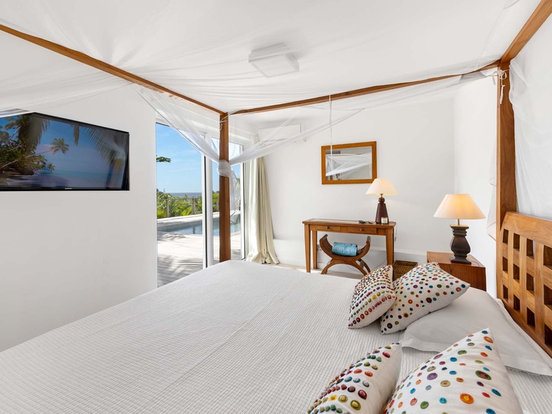 The villa is multi-level. On the main level is the living room, which has Indonesian style furniture and opens to the terrace with an ocean view. A bar separates the living area from the well-equipped kitchen. Located off the living room and kitche...