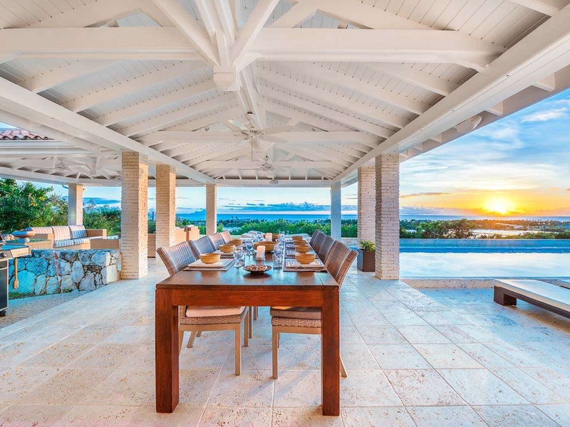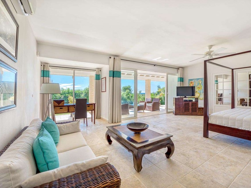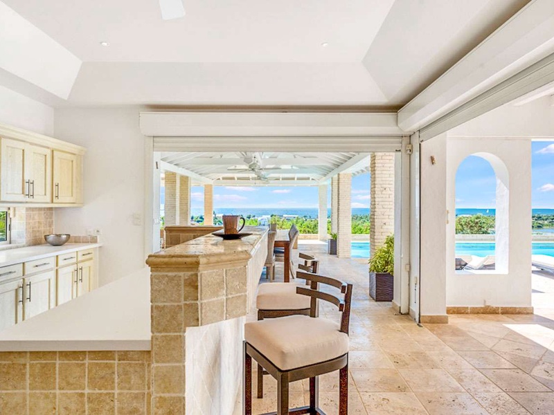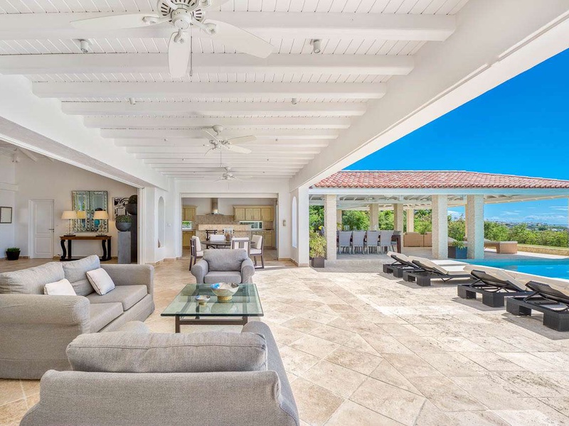 The spacious living area with sectional sofas and a large plasma TV opens to the covered terrace and pool area beyond. Adjacent to the living area is a small indoor dining area and well-equipped kitchen with a barbecue. A second dining area with seating for 8 guests is locate...