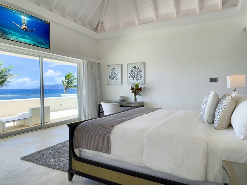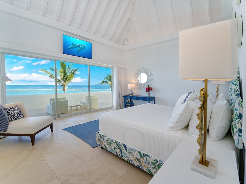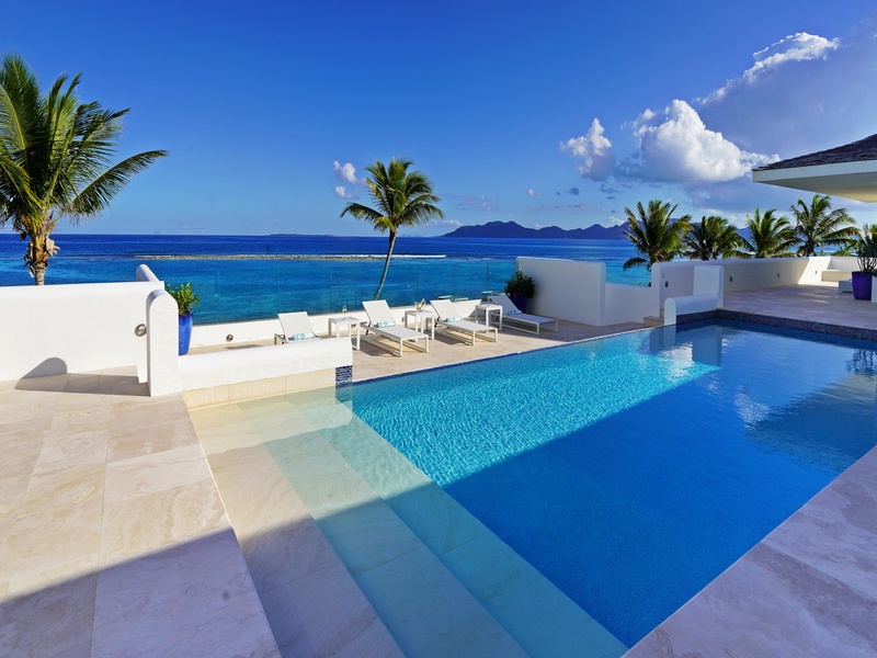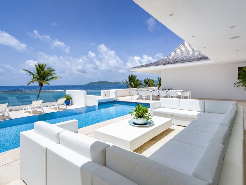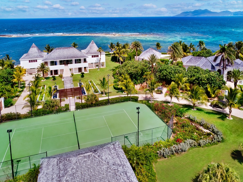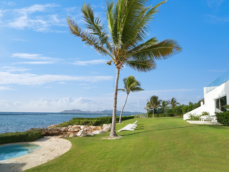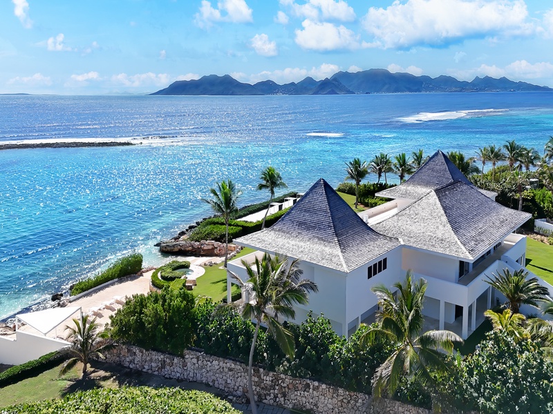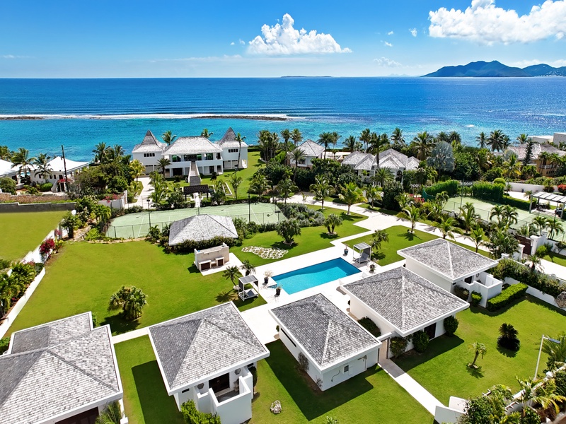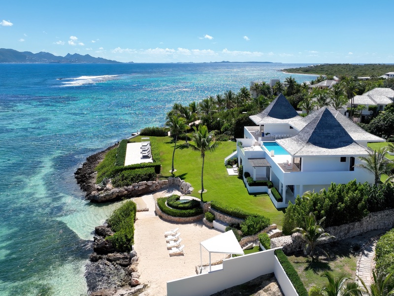 Welcome to Villa Le Bleu (villa code: AXA BLE), a luxurious 11-bedroom tropical estate located on the island of Anguilla in the British West Indies. Set on two lush acres, the property includes a grand main house and a charming guesthouse called Petite Le Bleu. This stunning villa boasts beautifully designed master suites, each with serene views of St. Martin and St. Barts across the sparkling Caribbean Sea.