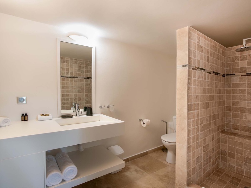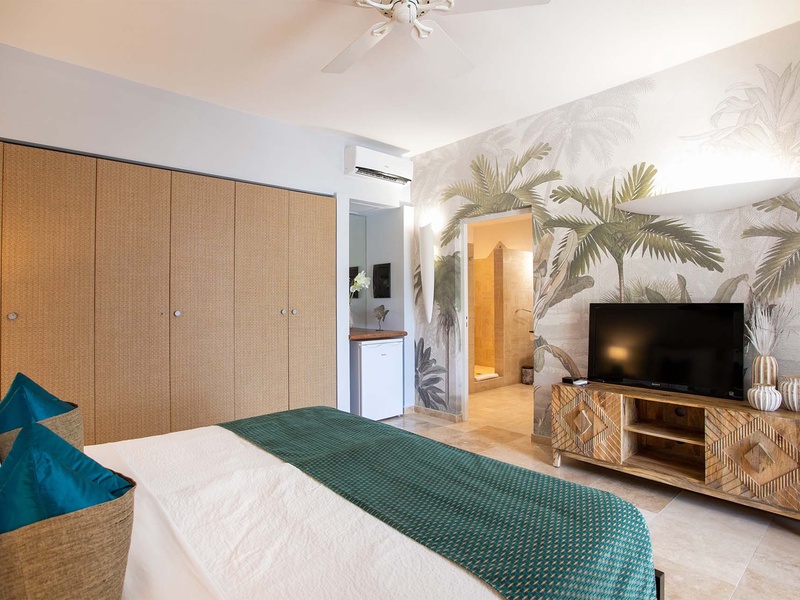 Fully air-conditioned, Villa Les Palmiers Bleus spacious bedrooms each have an ensuite bathroom and there’s a studio as the 5th bedroom with its ensuite bathroom. The 3rd and 4th bedrooms open to the exterior and have a view of t...