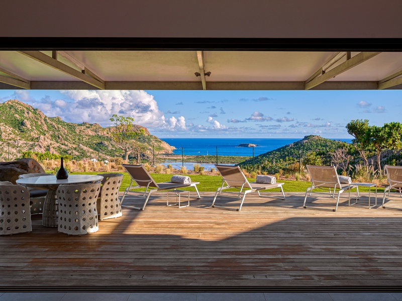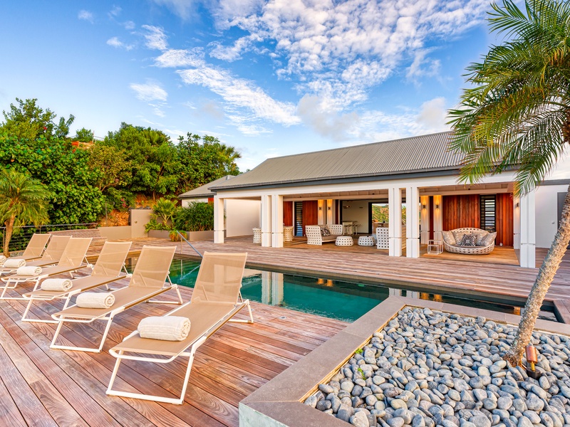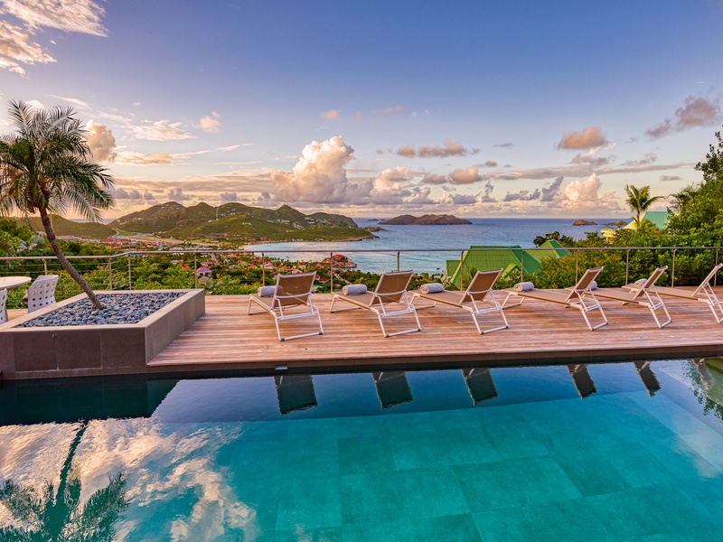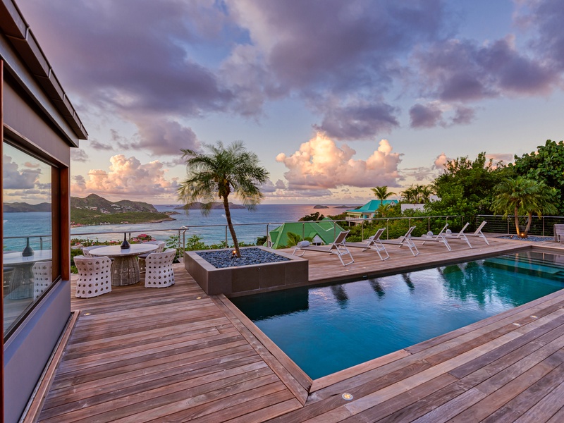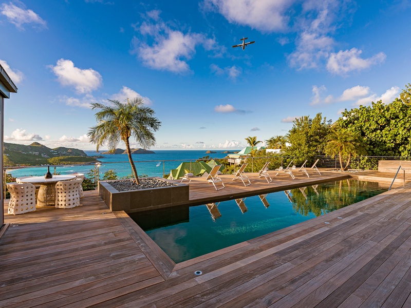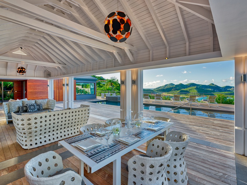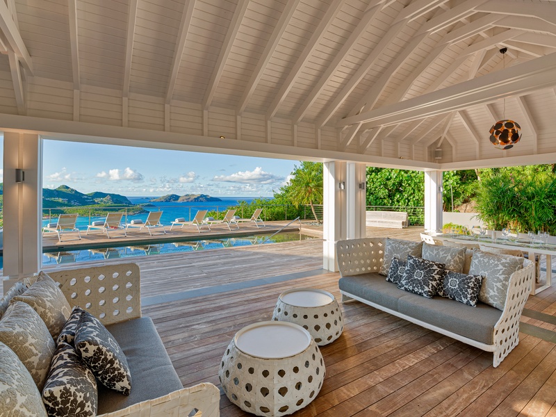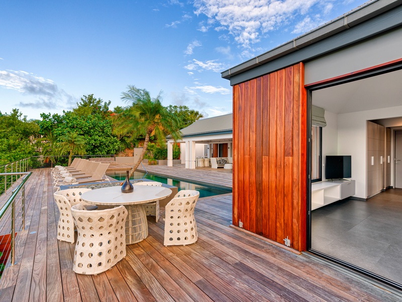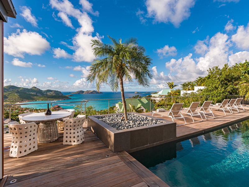 There's a poolside guest bath and a covered dining terrace. The views of St. Jean from here are sensational! A rear deck and a garden area with a BBQ provides an additional dining venue (seating for...