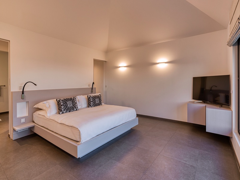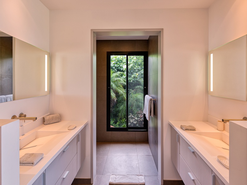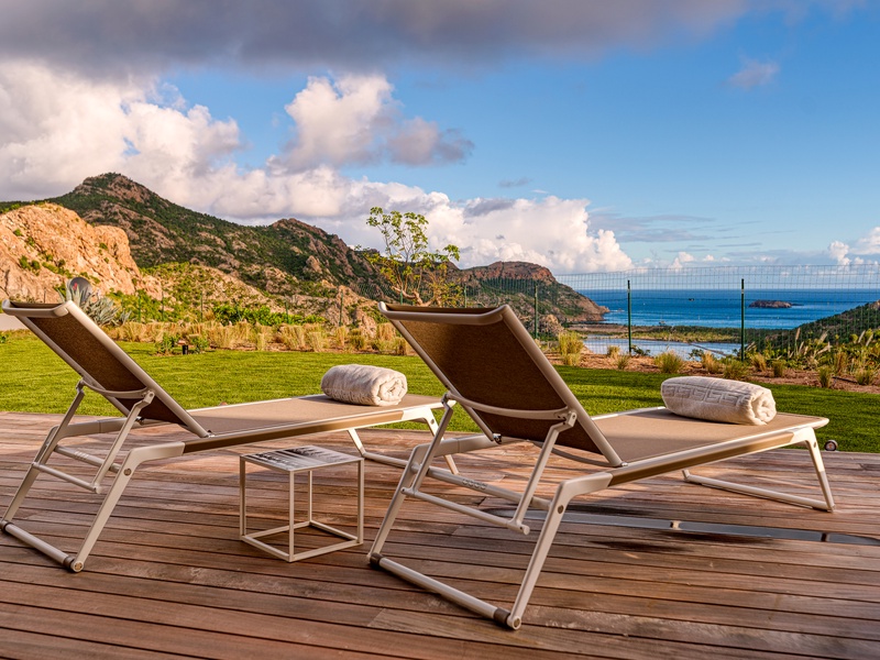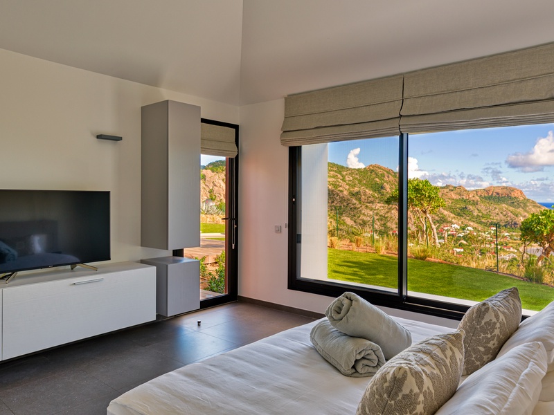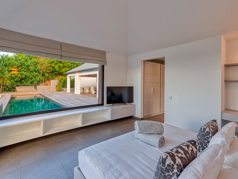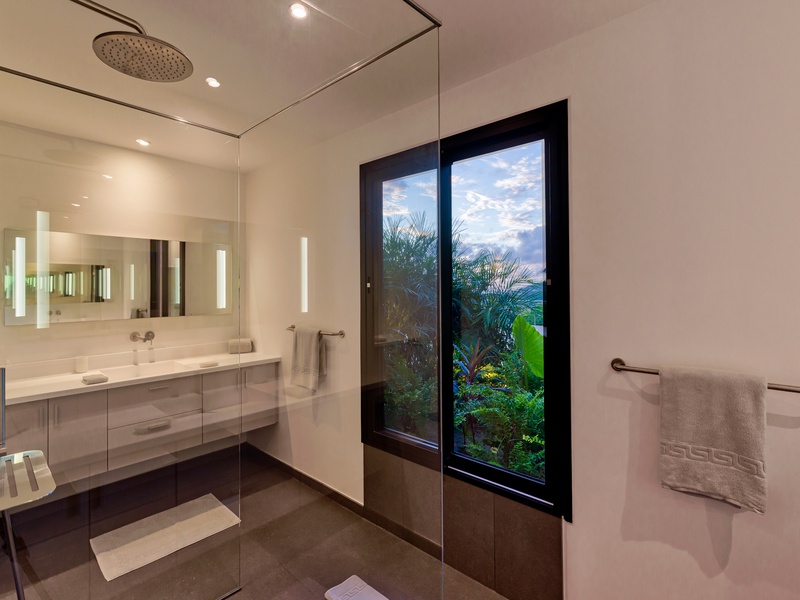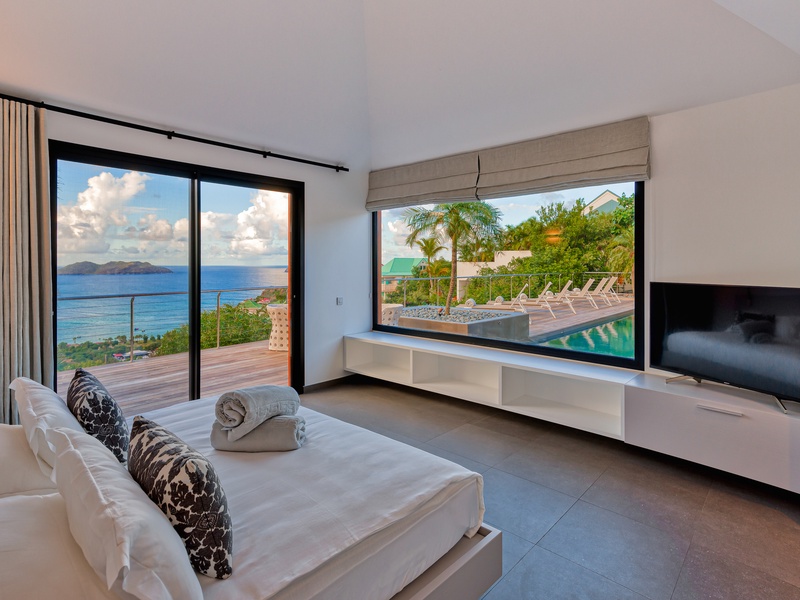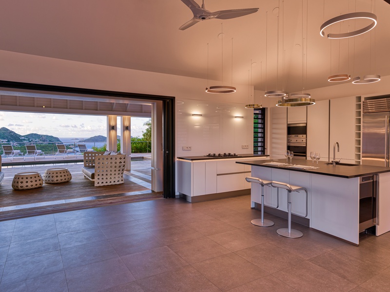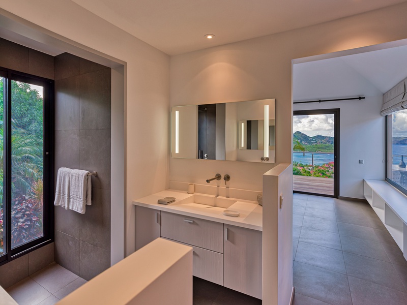 There's a poolside guest bath and a covered dining terrace. The views of St. Jean from here are sensational! A rear deck and a garden area with a BBQ provides an additional dining venue (seating for...