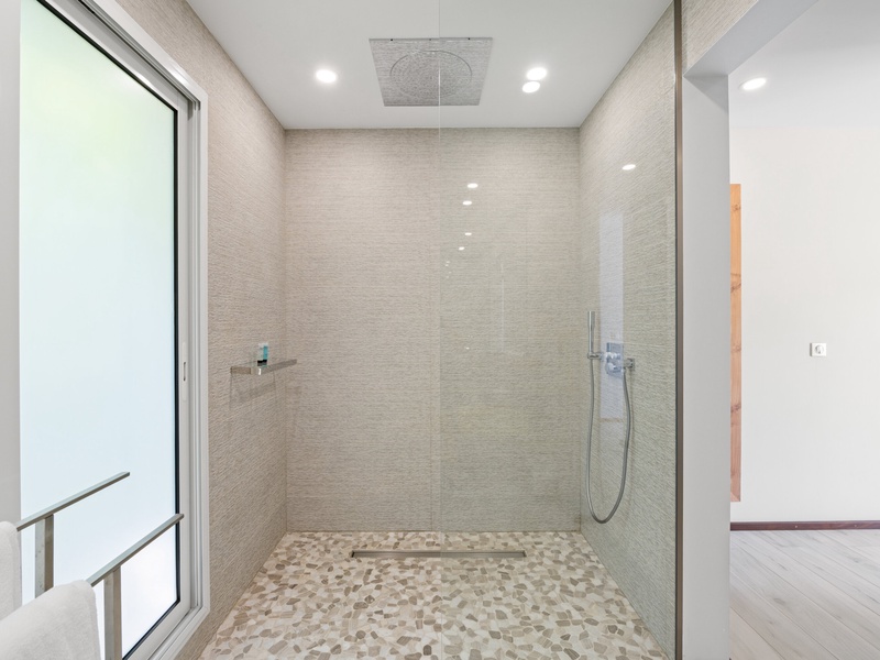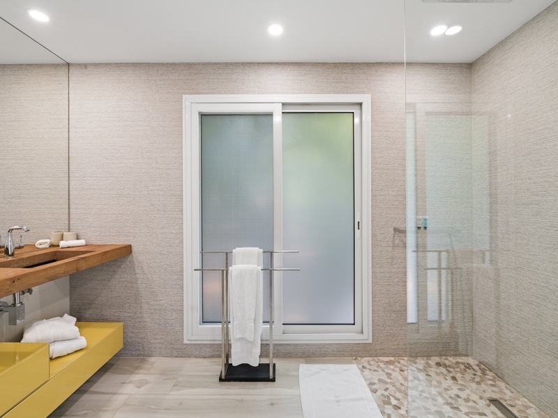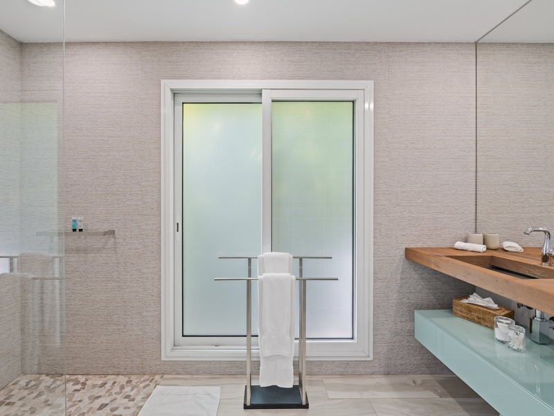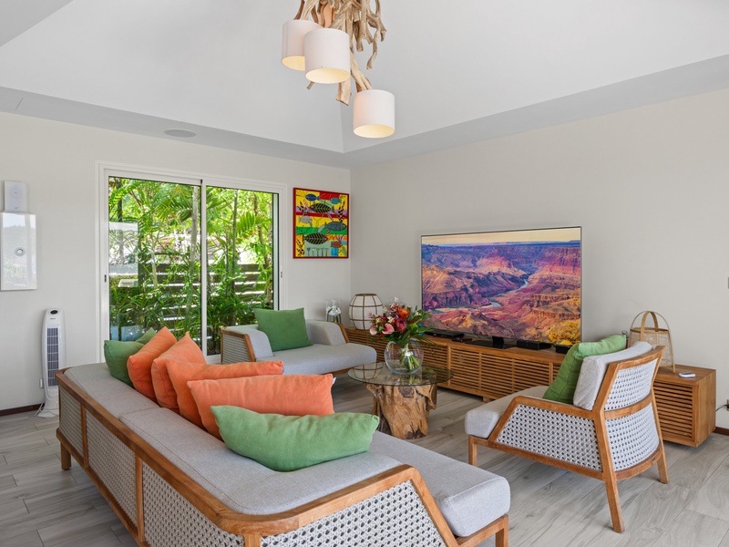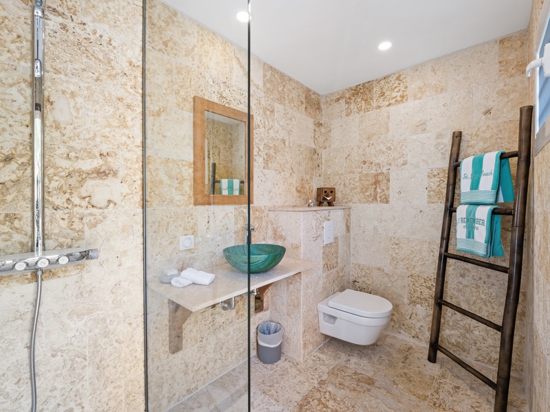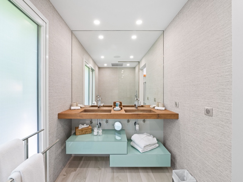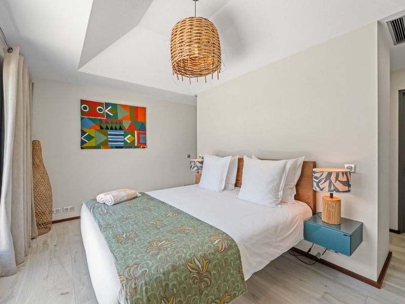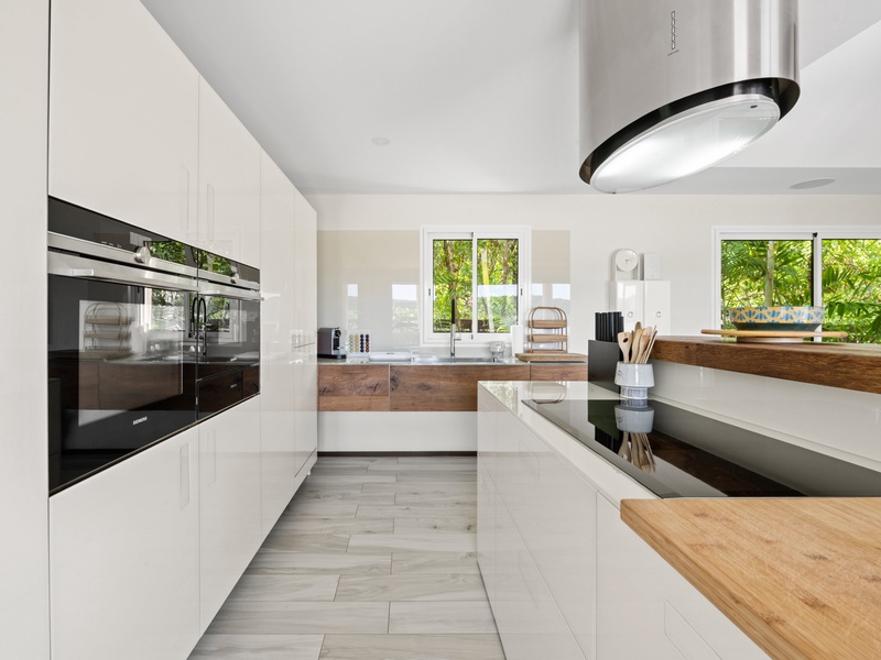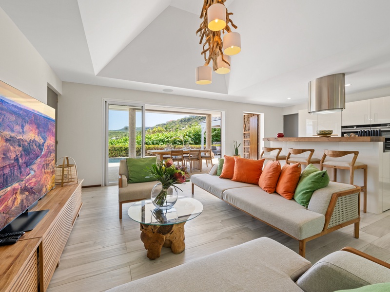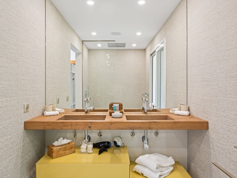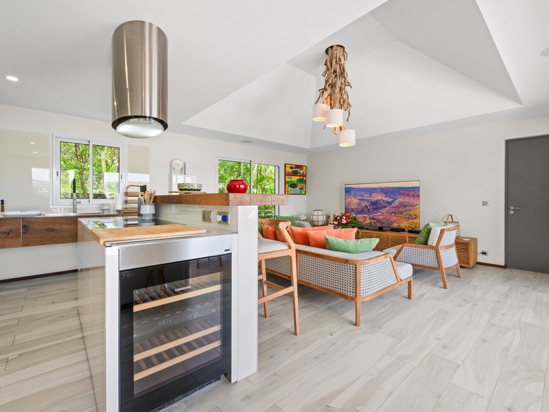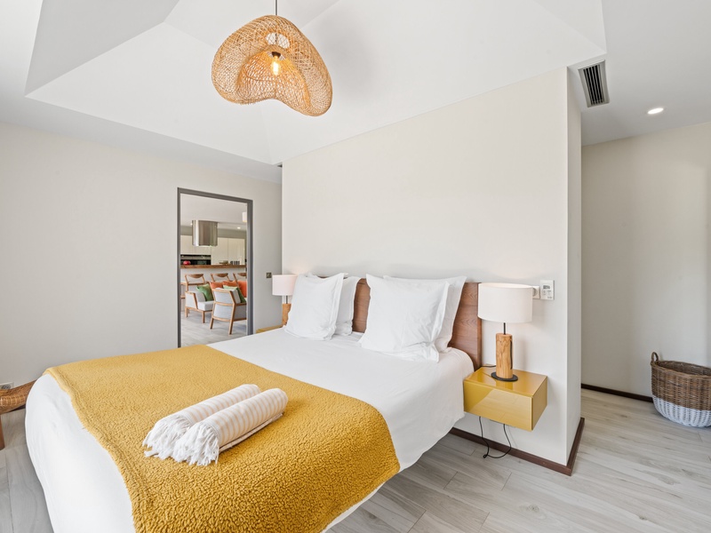 Blending modern elegance with the comforts of a luxury home, this villa features a fully equipped kitchen perfect for culinary enthusiasts and a spacious living room with a large TV for serene relaxation. Both master bedrooms include en-suite bathrooms and plush bathrobes, creating an inviting, cozy atmosphere.