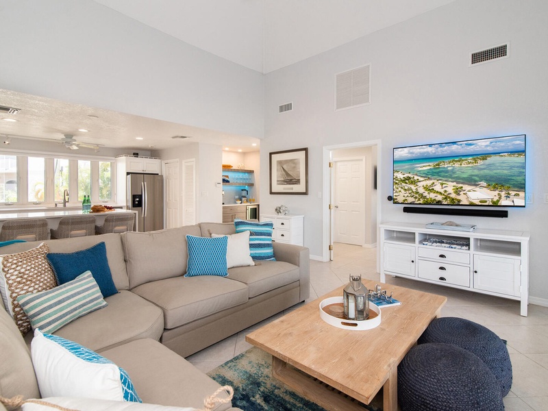 As you enter the home, your eyes are drawn through a wall of sliding glass doors to the shimmering turquoise blue waters. Coconut palm trees, an elevated sundeck, a private dock, and a seaside hammock...
