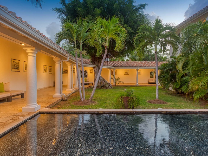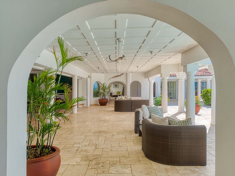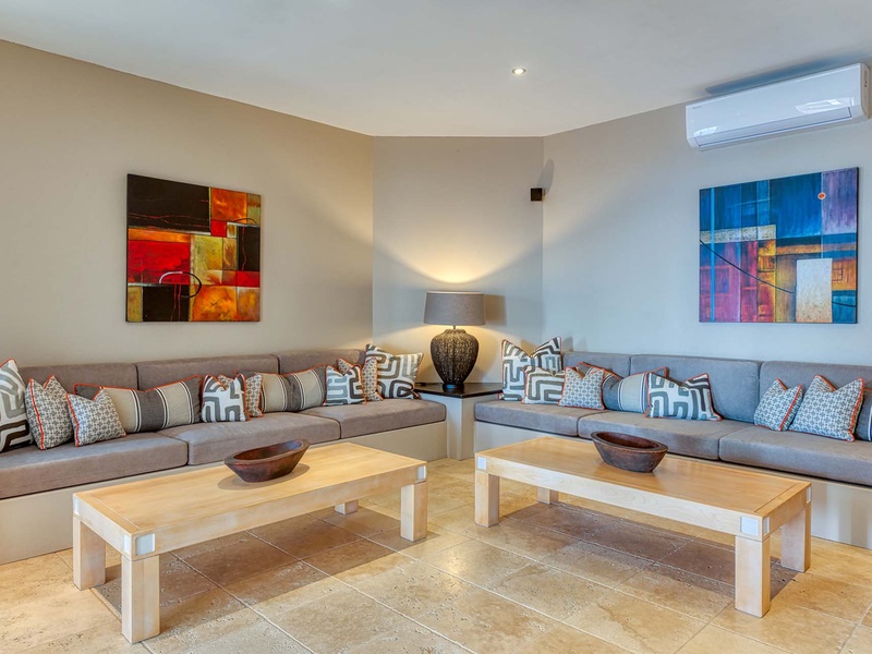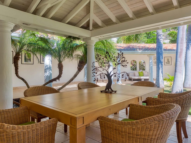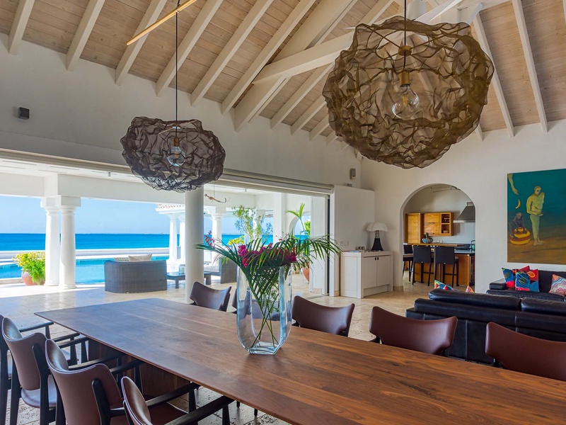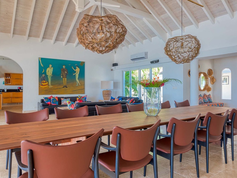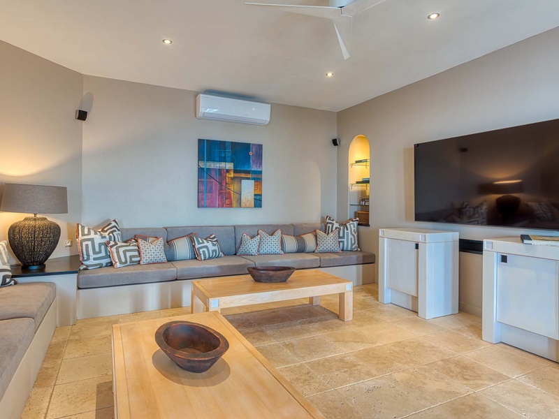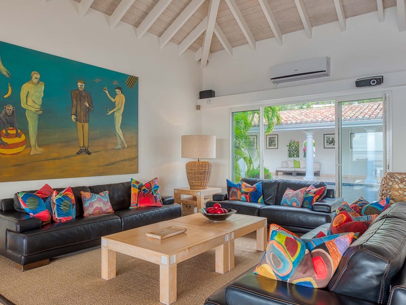 The spacious great room with contemporary furnishings, a film projector, and a high ceiling opens to an outdoor sitting area underneath a covered terrace. The great room comprises a living area and dining table, which seats 8 guests. The separate TV room has ecle...