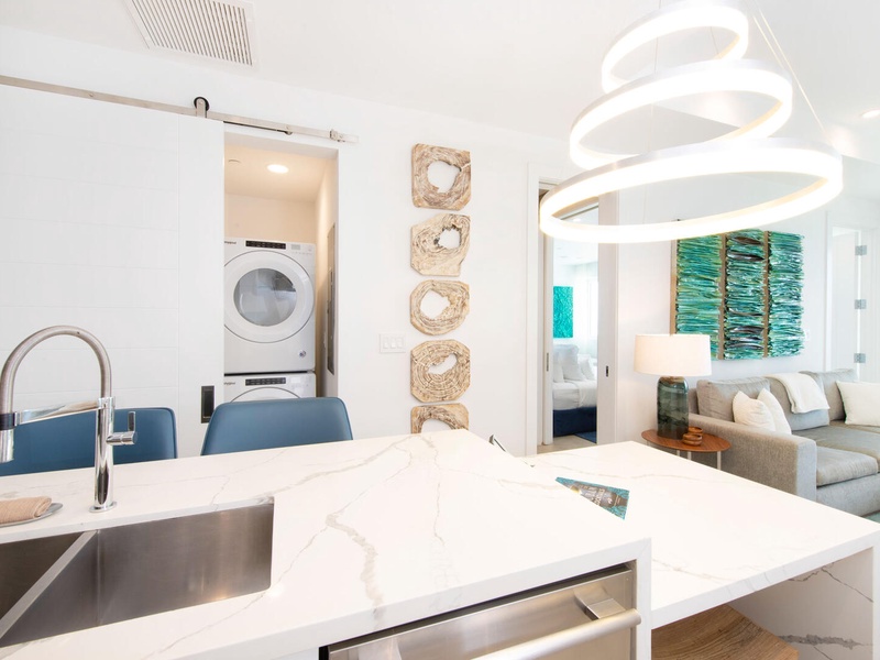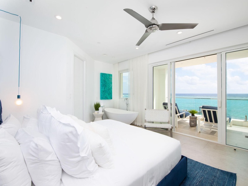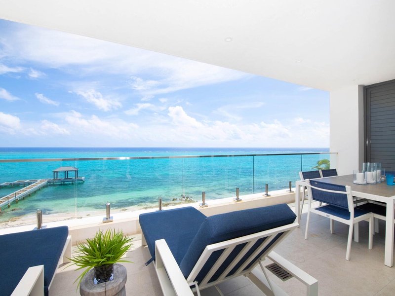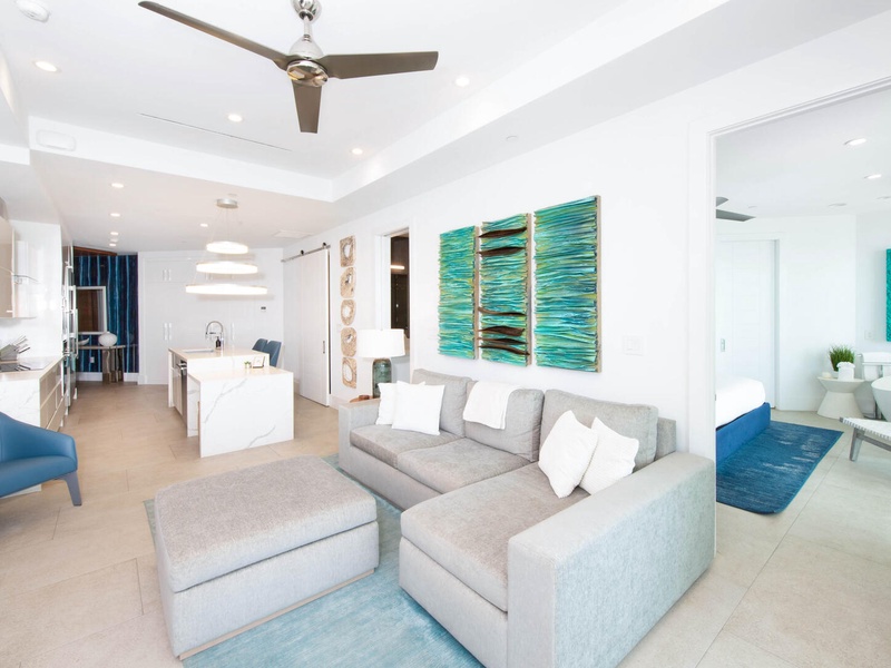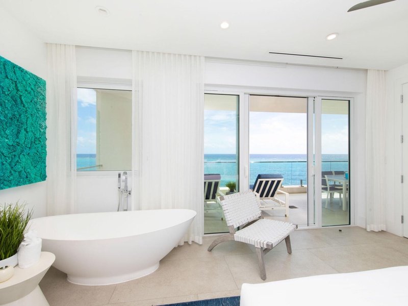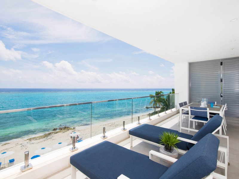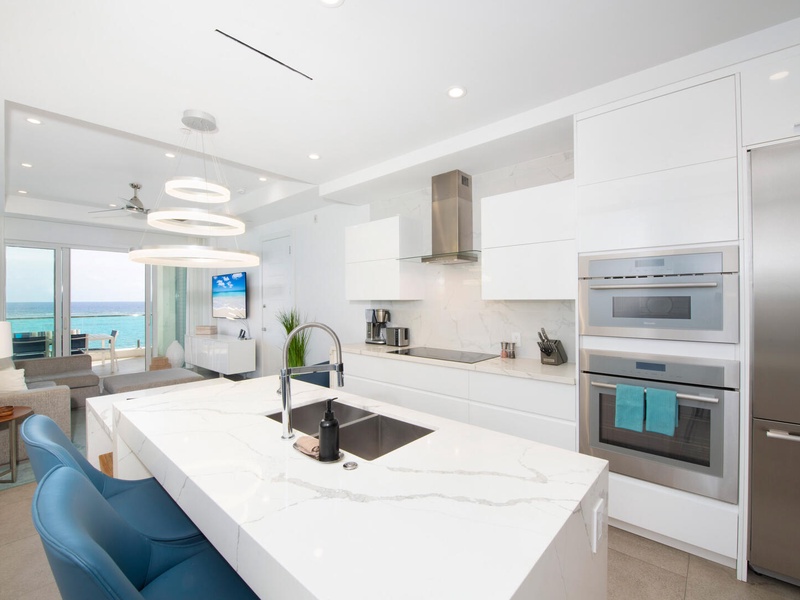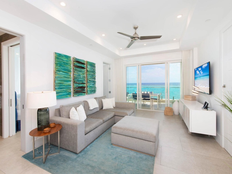 All Rum Point Resort condos feature sleek finishes, designer decor, and an open-concept layout maximizing space, natural light, and stunning ocean views. All the comforts of home are included in this 1,250 sq. ft. condo including gourmet kitchen appliances, quartz countertops, SmartTVs throughout, and a private oceanfront balcony.