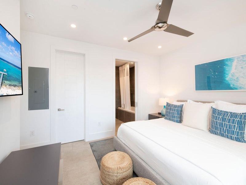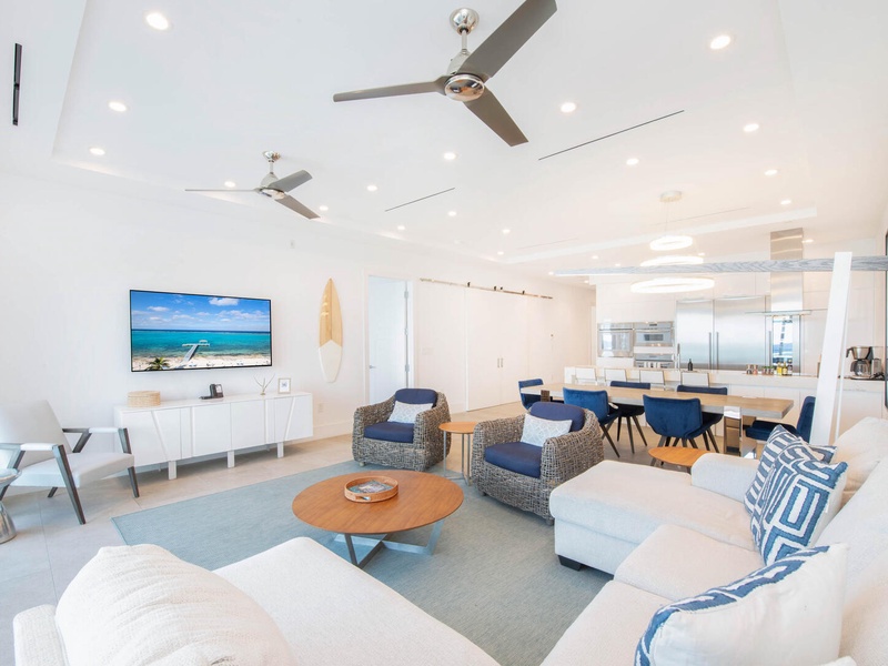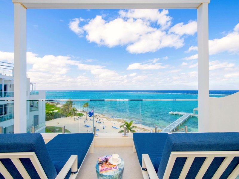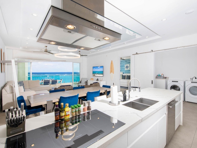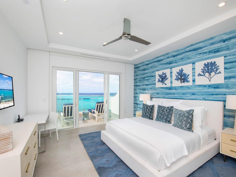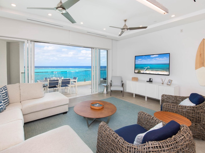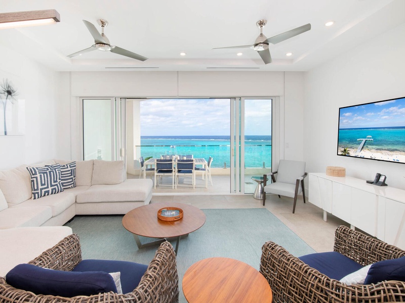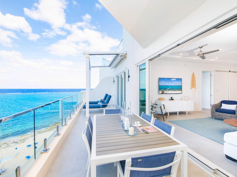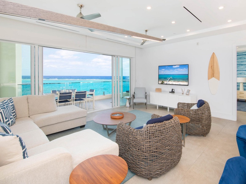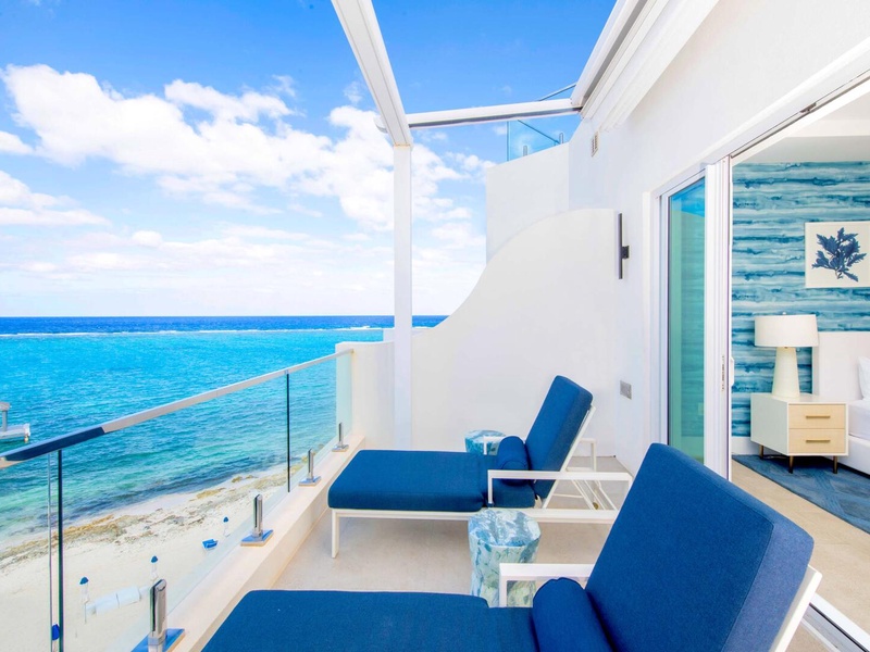 All Rum Point Resort condos feature sleek finishes, designer decor, and an open-concept layout maximizing space, natural light, and stunning ocean views. All the comforts of home are included in this 2,250 sq. ft. 3-bedroom condo including gourmet kitchen appliances, quartz countertops, SmartTVs, and a private oceanfront balcony.