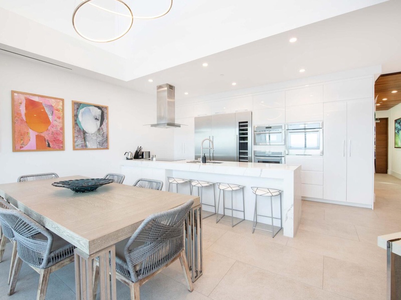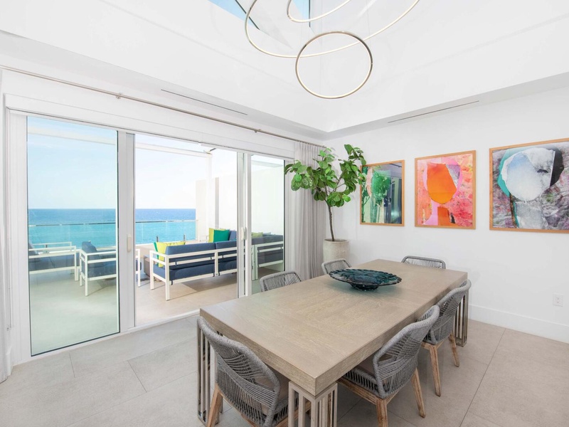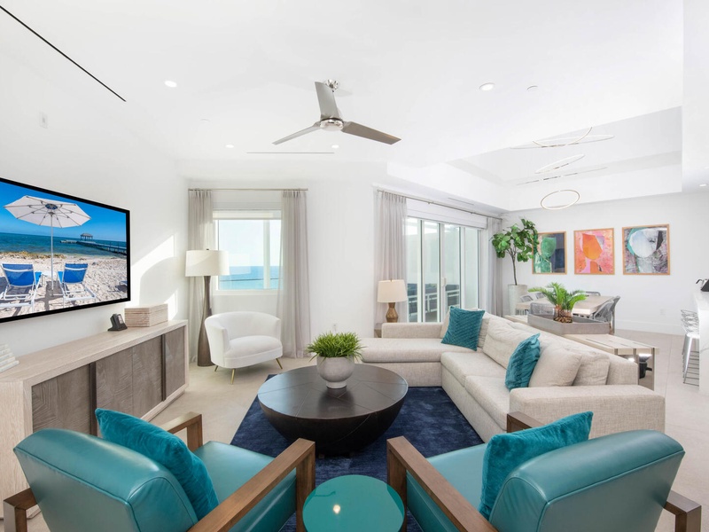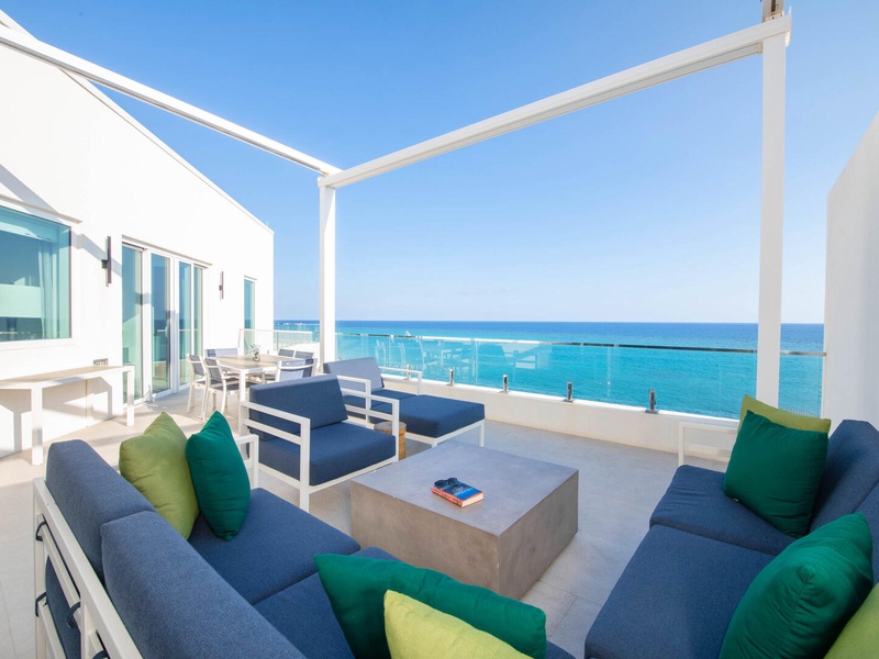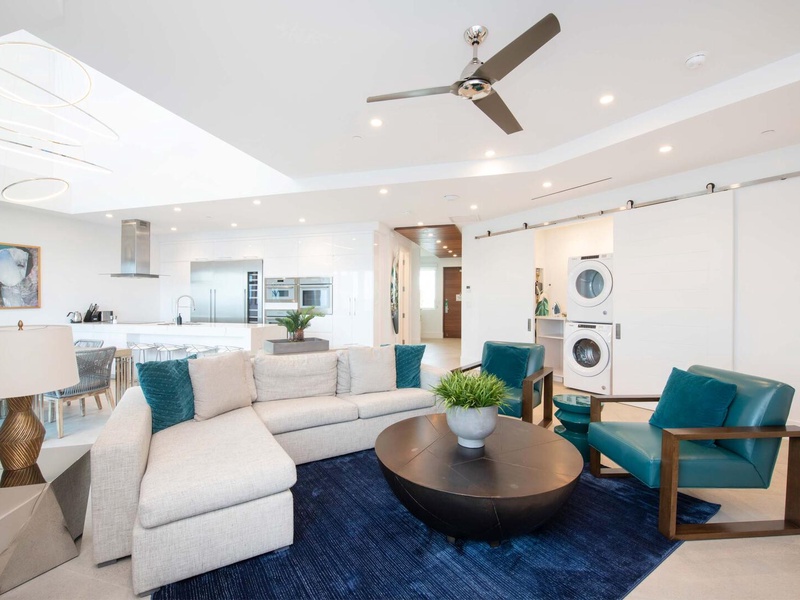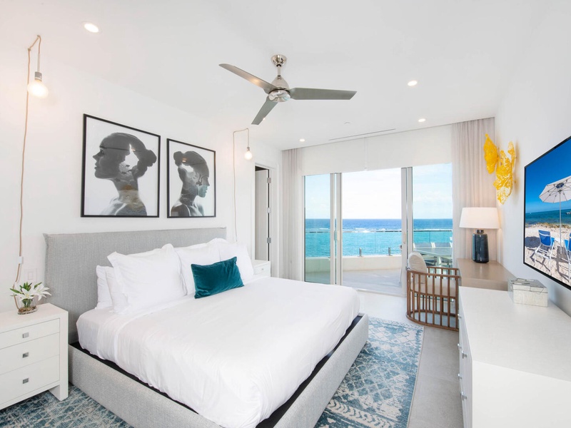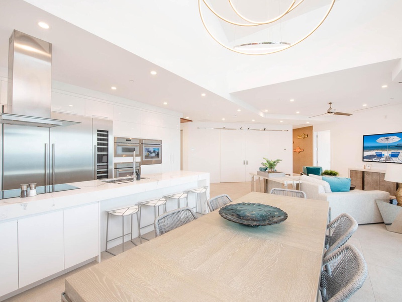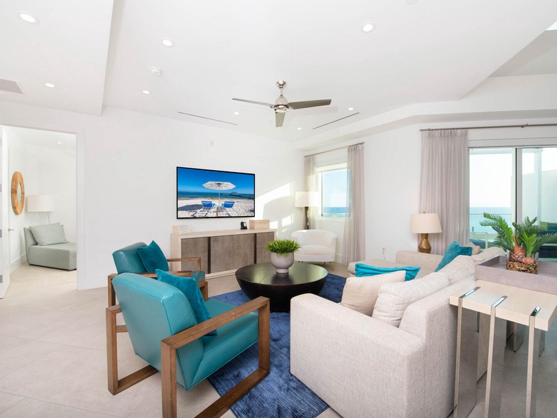 All Rum Point Resort condos feature sleek finishes, designer decor, and an open-concept layout maximizing space, natural light, and stunning ocean views. All the comforts of home are included in this 2,620 sq. ft. penthouse condo including gourmet kitchen appliances, quartz countertops, SmartTVs throughout, and a private open-air oceanfront balcony.