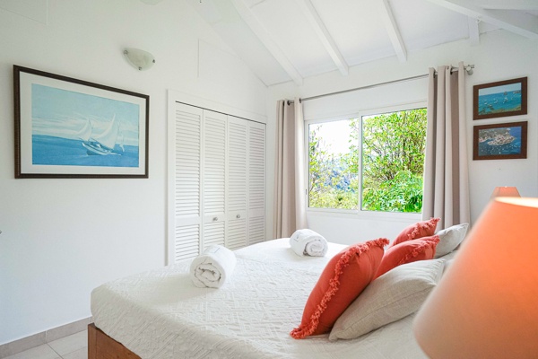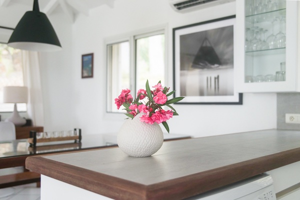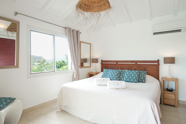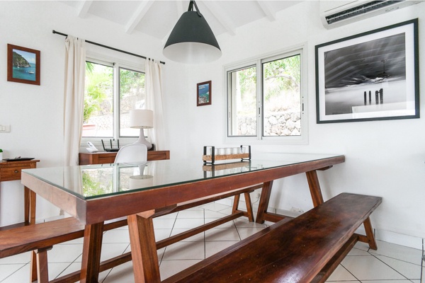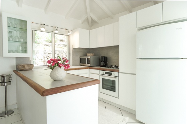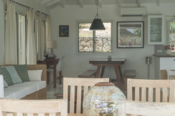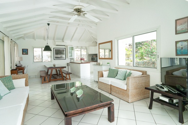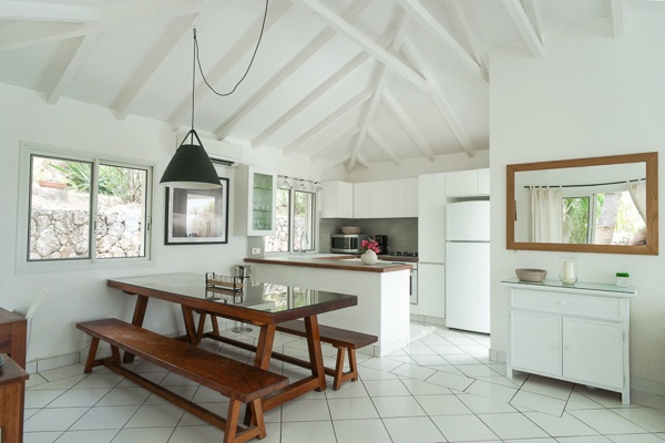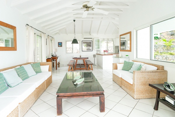 The interiors at Villa St. Jean Lataniers are awash with calming color, from the white walls to the sea-green trim and soft, wooden accents. Pictures of the sea adorn the walls, and the entire home welcomes plenty of tranquil island light. Staying here is...