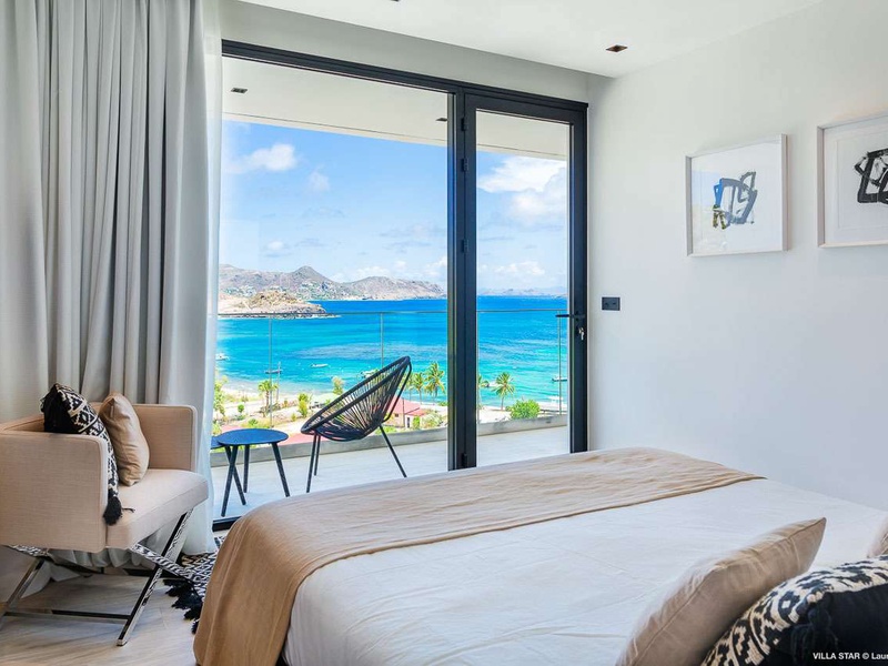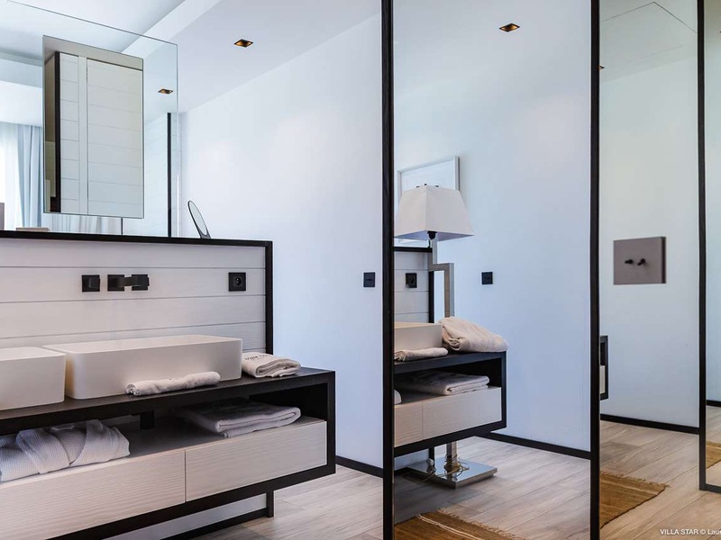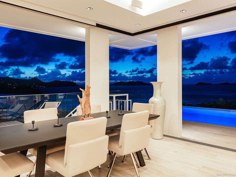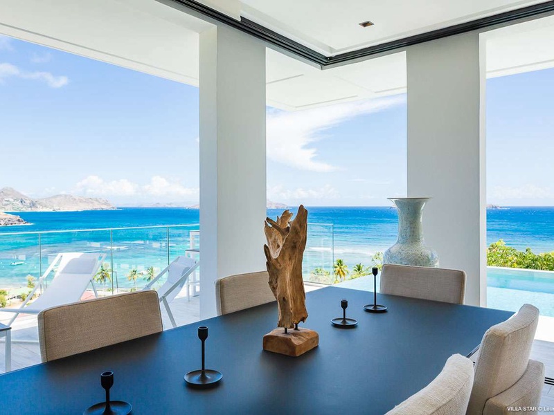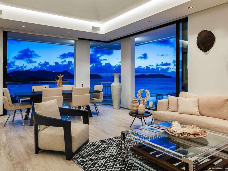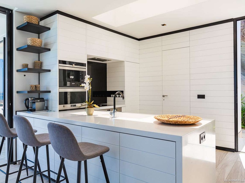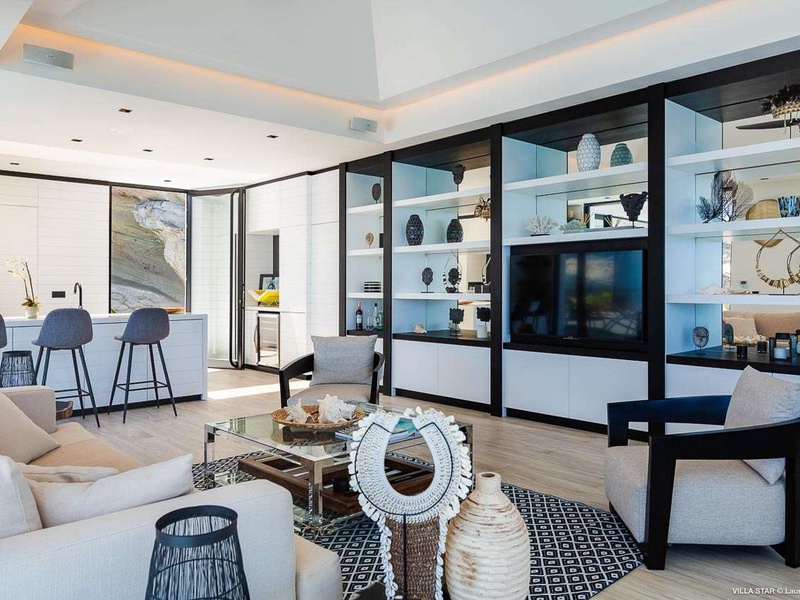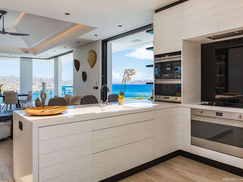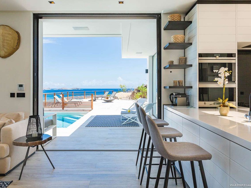 The interiors of Villa Star are sleek and chic, contemporary white with black trim creating a luxurious atmosphere. Stylish furnishings offer comfortable spots to relax, while large doors let in plenty of island breezes and natural light.