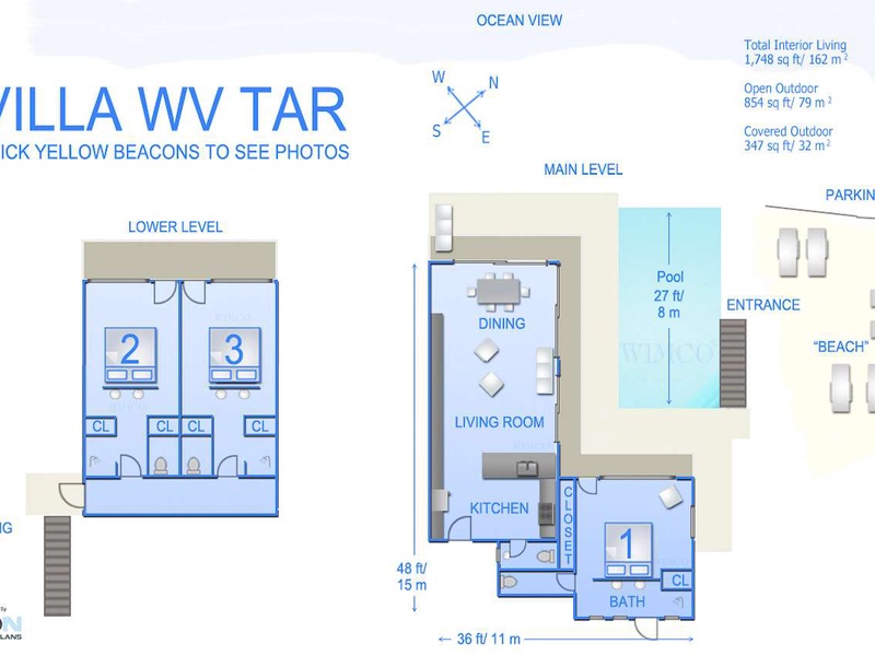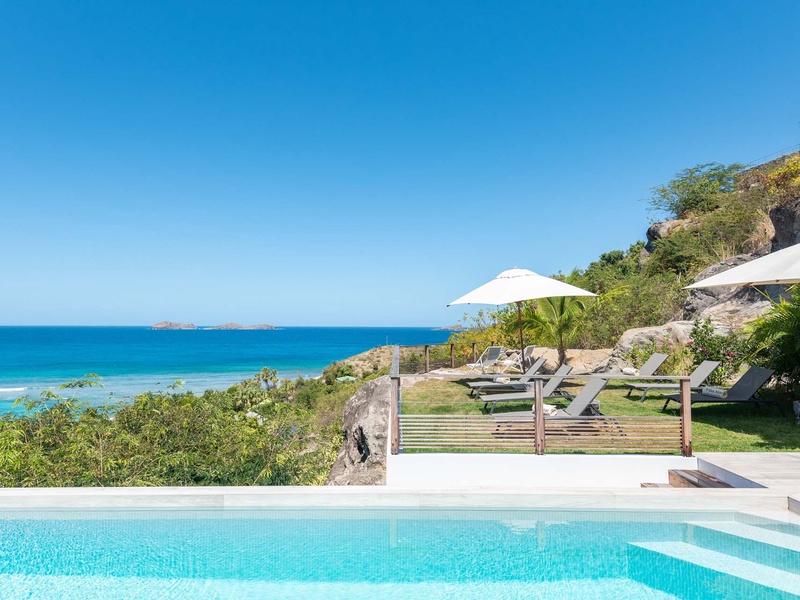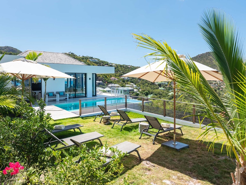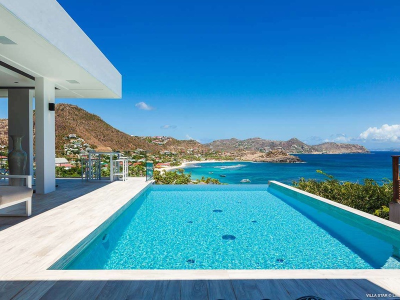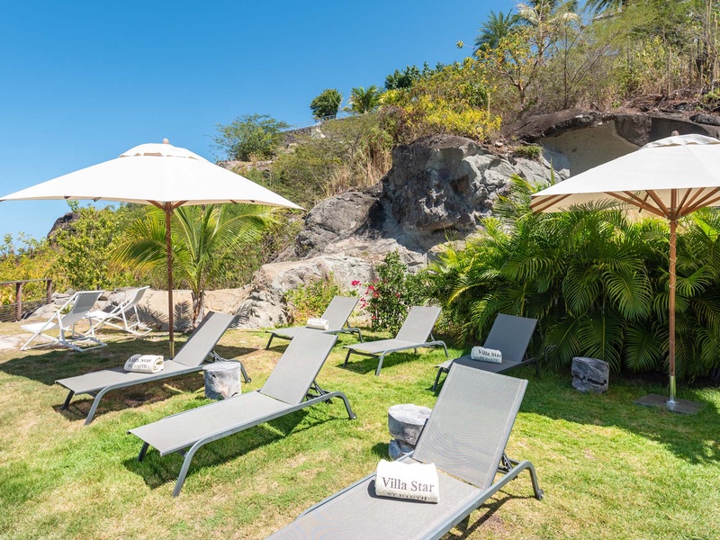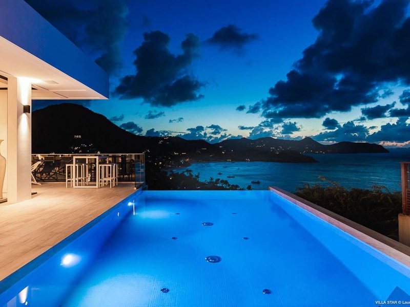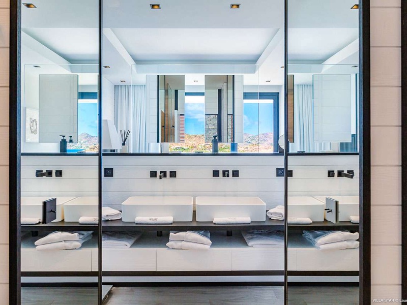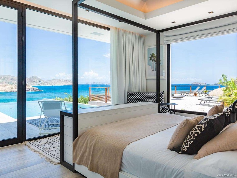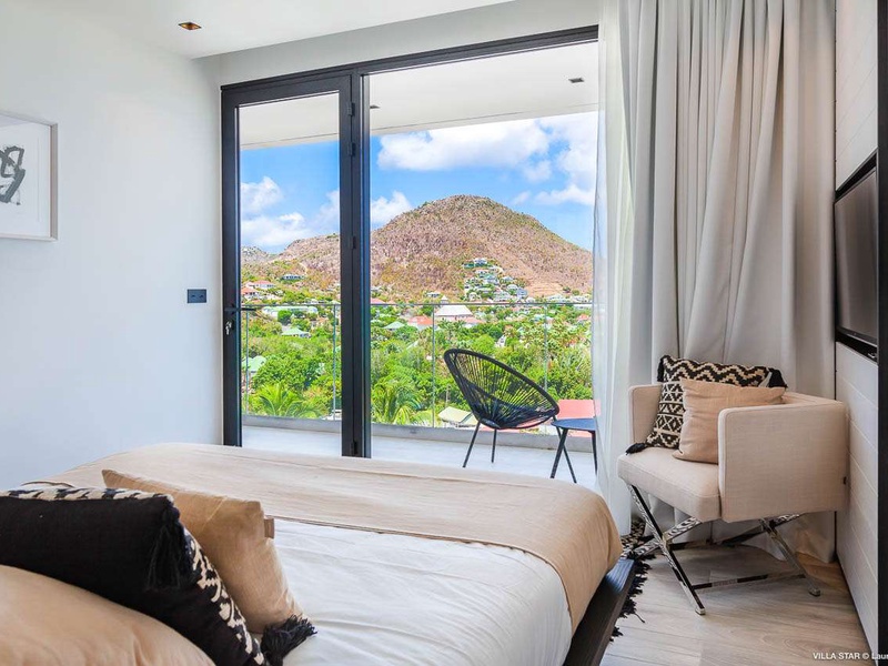 The interiors of Villa Star are sleek and chic, contemporary white with black trim creating a luxurious atmosphere. Stylish furnishings offer comfortable spots to relax, while large doors let in plenty of island breezes and natural light.