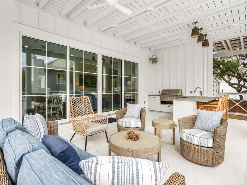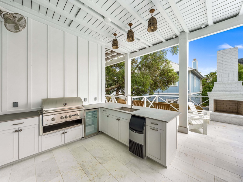 - Fenced in pool deck with summer kitchen with natural gas grill, ice maker, cushioned seating area, poolsi...