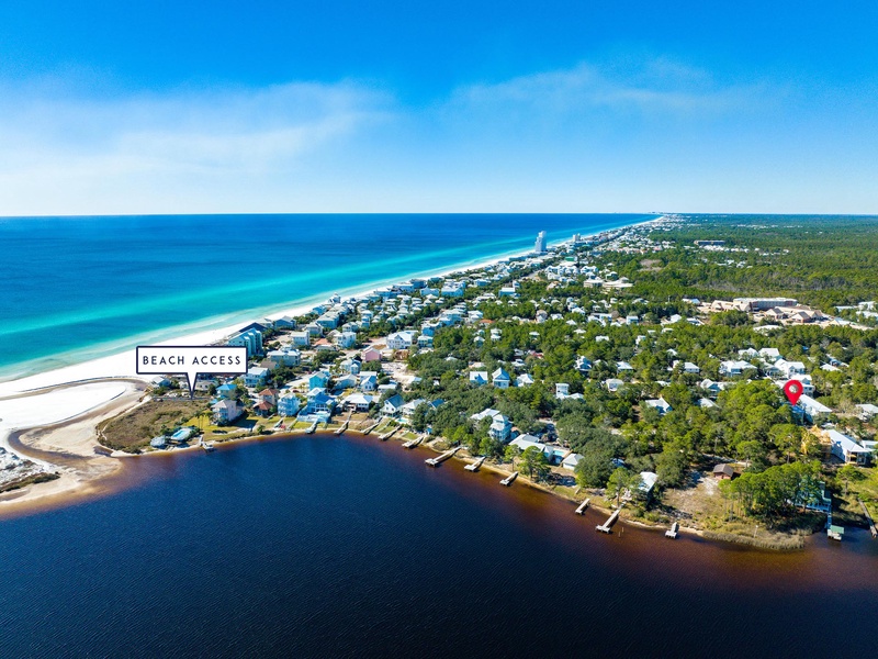 - 350 yards to the Eastern Lake Beach Access. The coastal dune lake flows into the Gulf at this beach entrance, a rare ecological phenomenon only found in 4 countries including the USA. You can visit 15 of these artisan spring fed lakes on 30A.