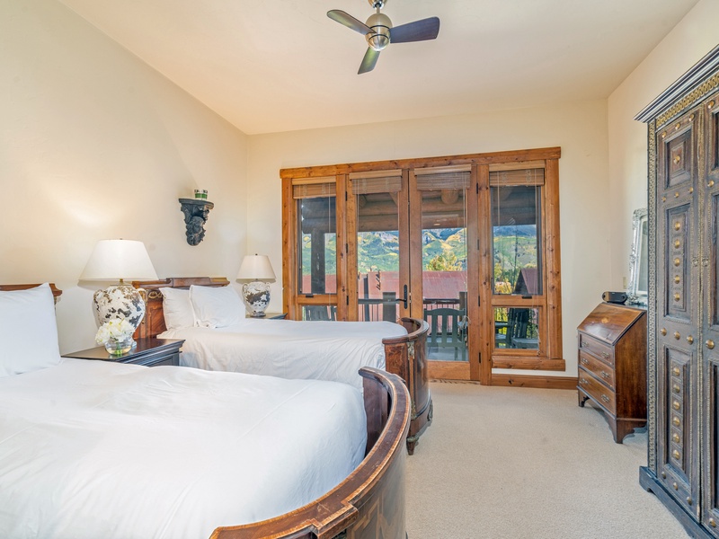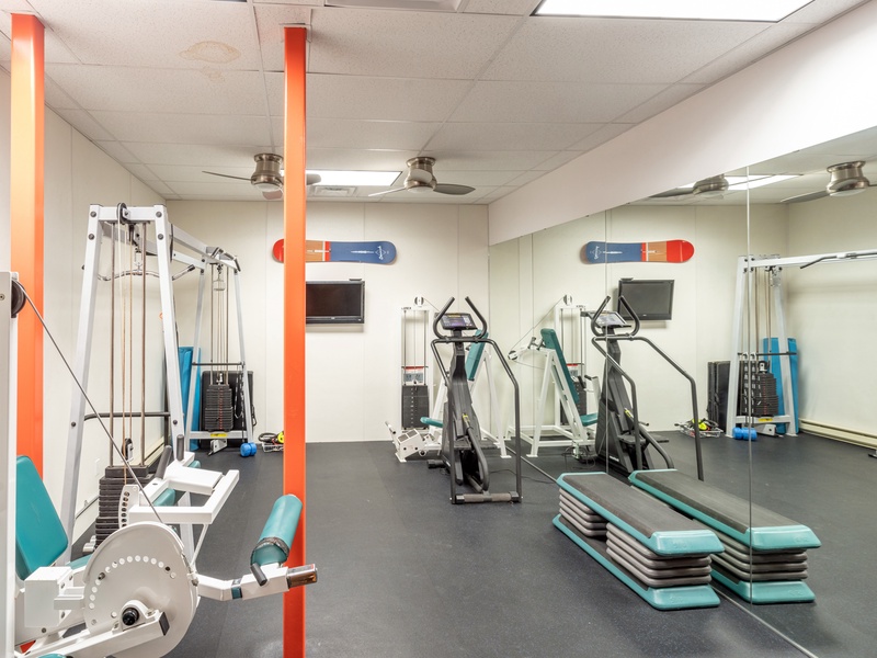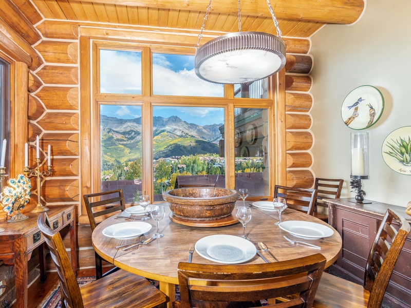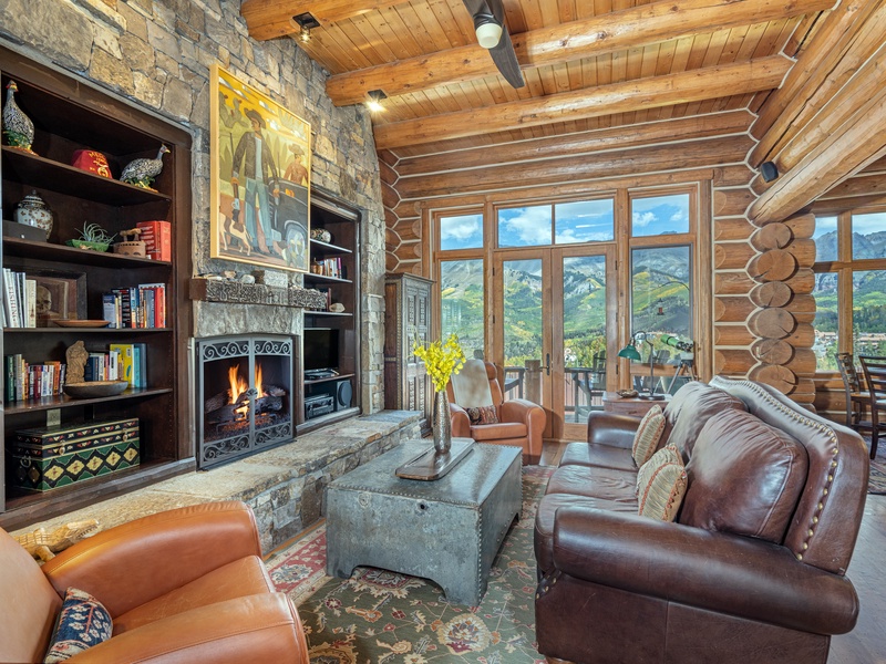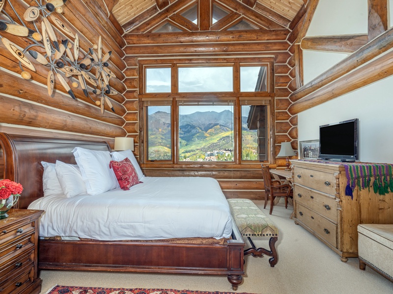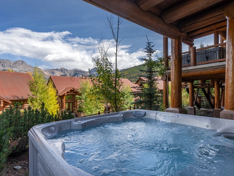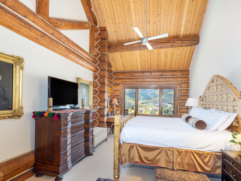 This four-bedroom residence offers excellent ski access via funicular to the Village Bypass ski run, vaulted ceilings, a fireplace, mountain views from every window, a private hot tub, a ski storage area, and a gym.