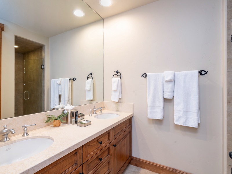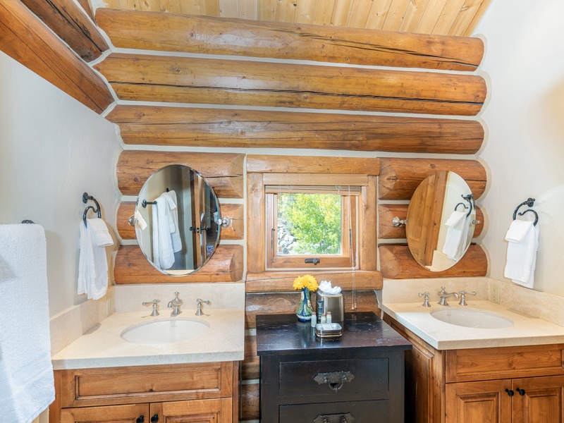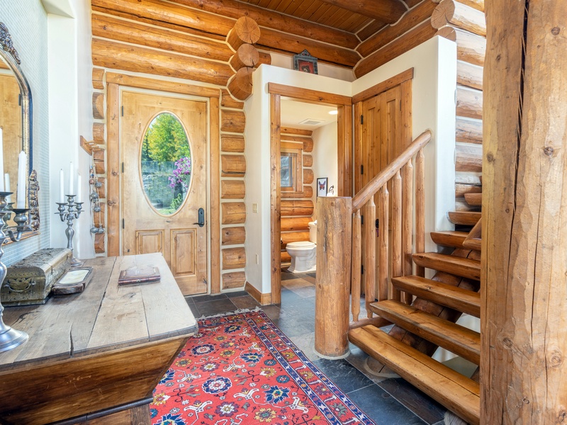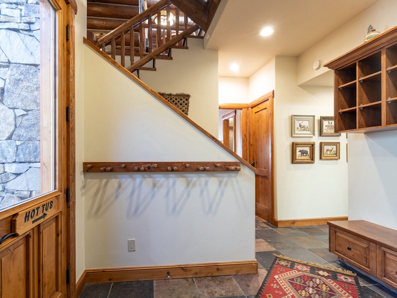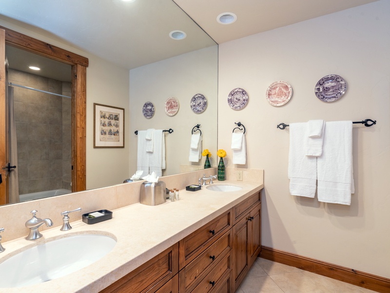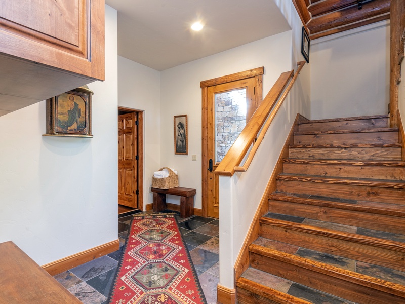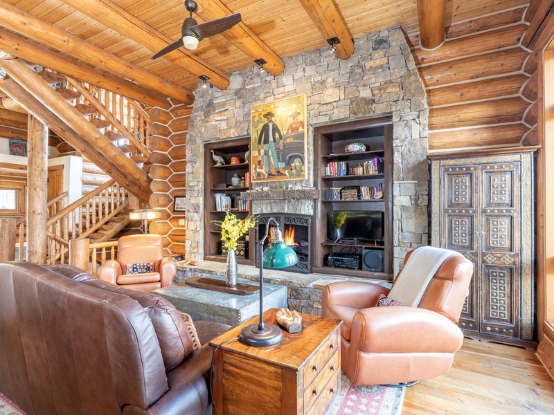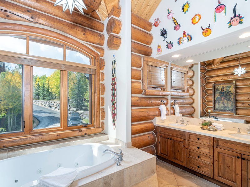 This four-bedroom residence offers excellent ski access via funicular to the Village Bypass ski run, vaulted ceilings, a fireplace, mountain views from every window, a private hot tub, a ski storage area, and a gym.