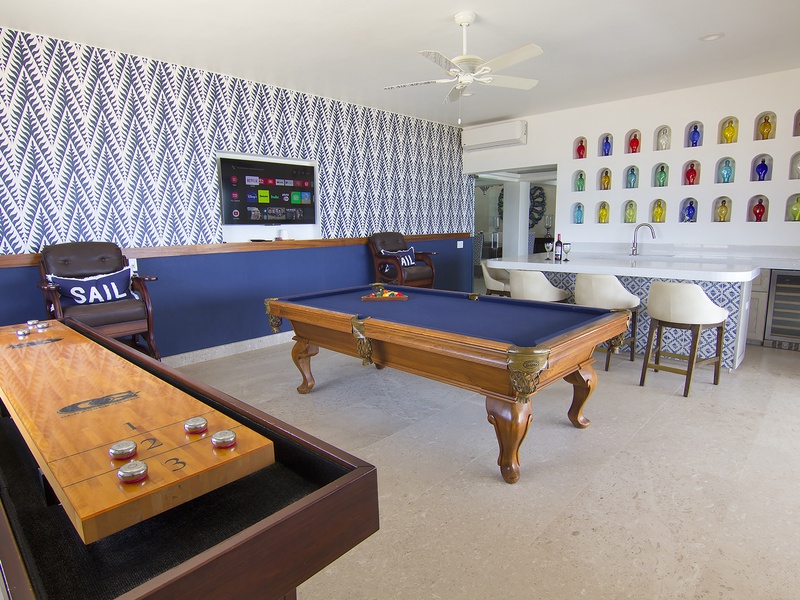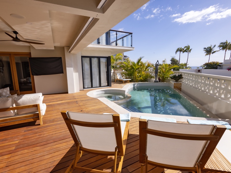 Rent these two neighboring villas together for a seamless, private retreat with panoramic ocean views and effortless indoor–outdoor living. One home sits just a house back from the beach with a sleek open layout, vibrant contemporary décor, and a private pool with spa—perfect for sun-soaked lounging and alfresco dinners. The other is set within a beachfront enclave and adds resort-style amenities: a large pool with a swim-up bar, an 8-person Jacuzzi, a gas BBQ patio, and spacious suites accented...