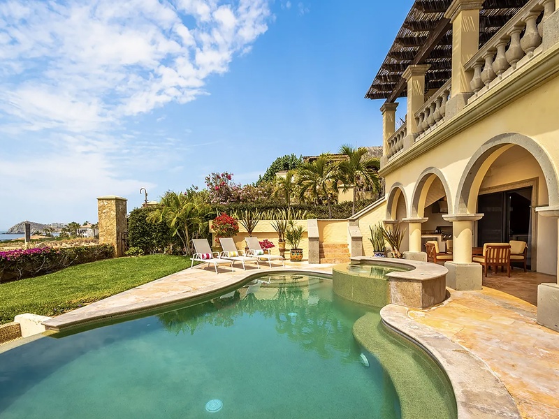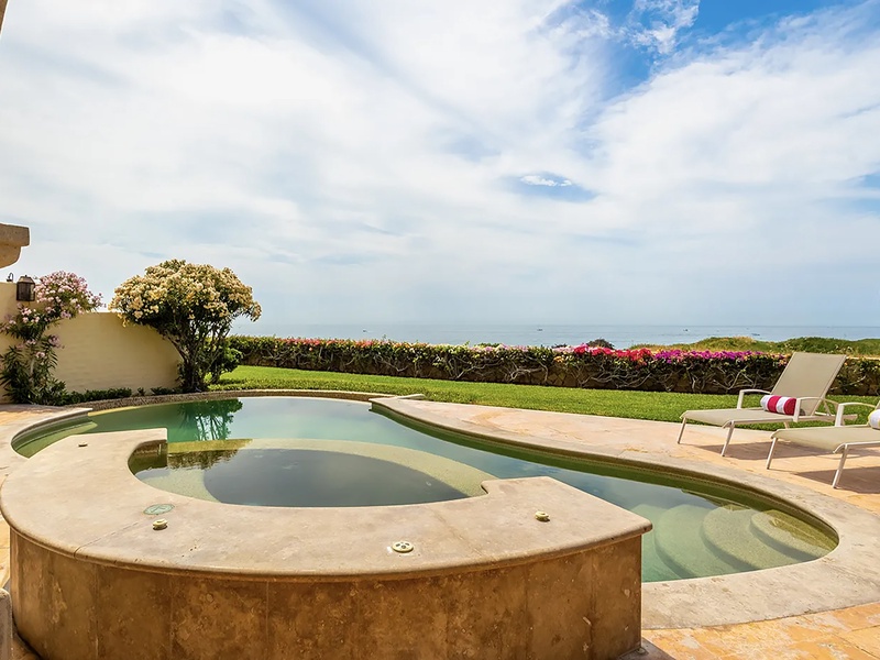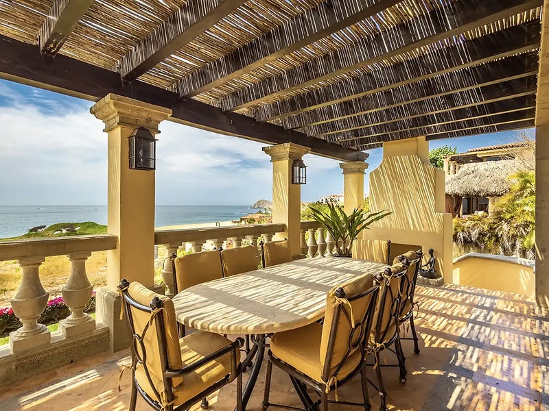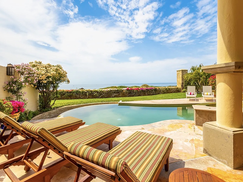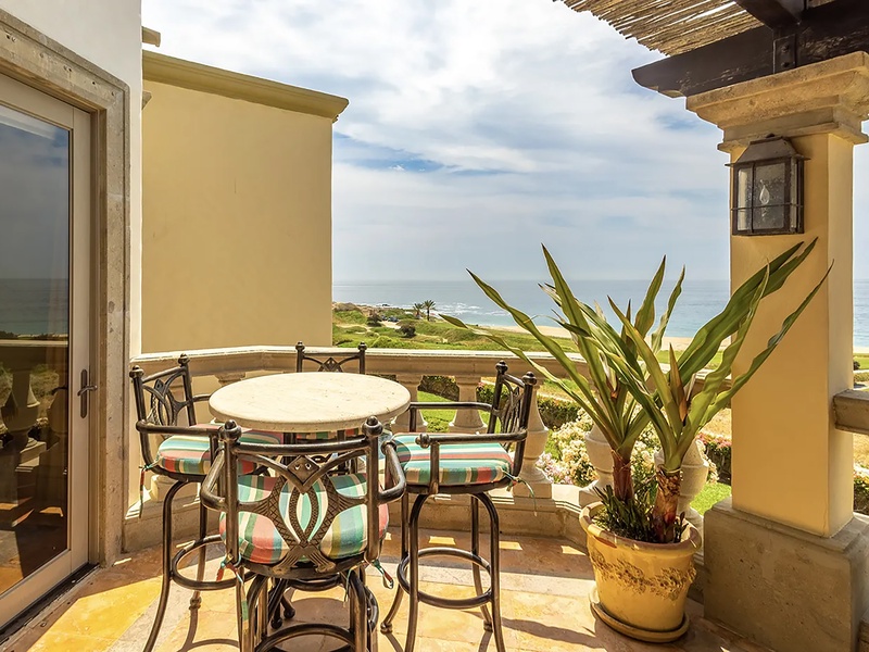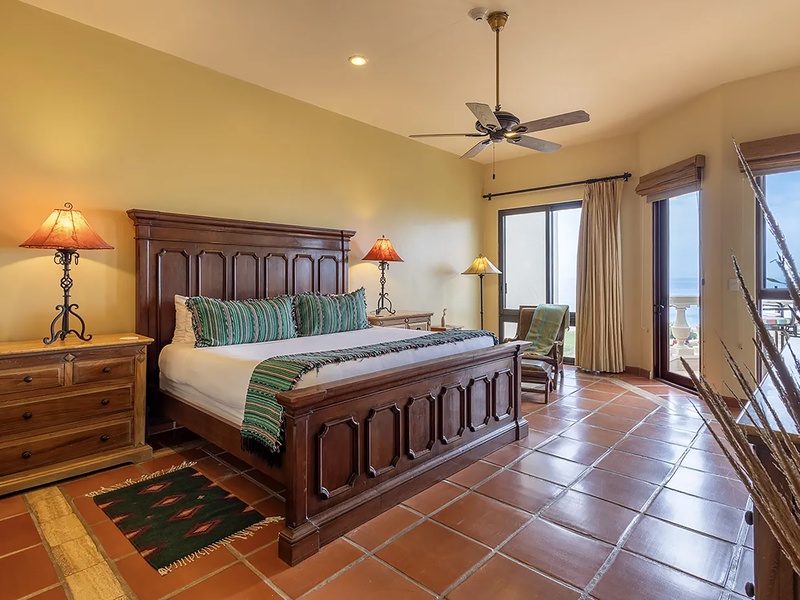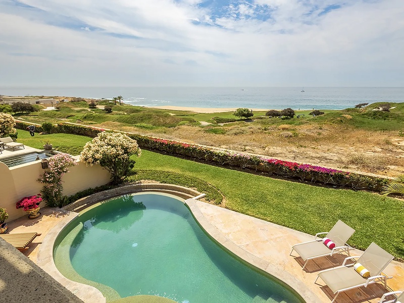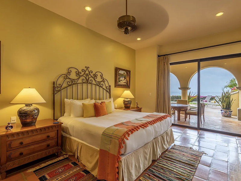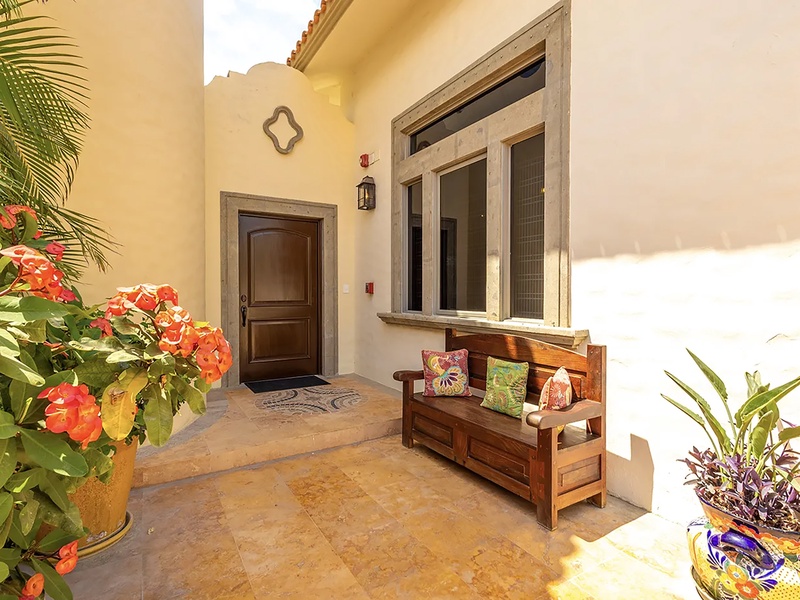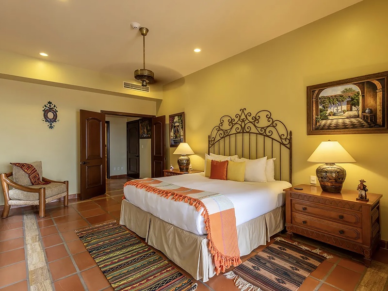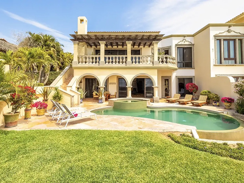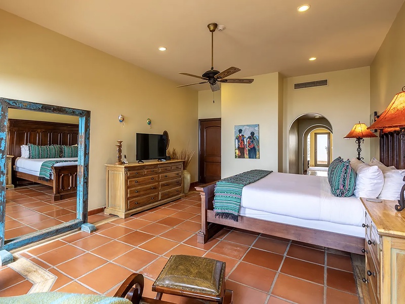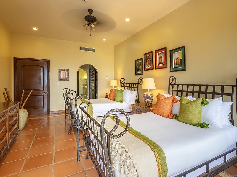 This oceanfront three-bedroom villa offers a peaceful retreat in one of Los Cabos’ most exclusive communities. Designed with timeless Hacienda-style charm, the home features warm wooden furnishings, colorful accents, and an inviting atmosphere throughout. Each of the three spacious bedrooms includes a private ensuite bathroom with both a shower and a tub—two with king-size beds and one with two full beds—ideal for families or groups of friends.