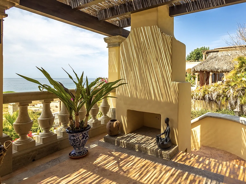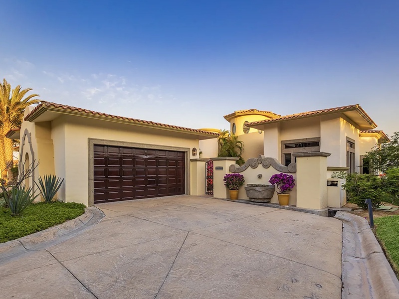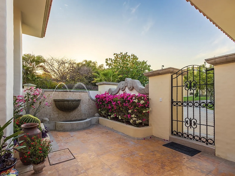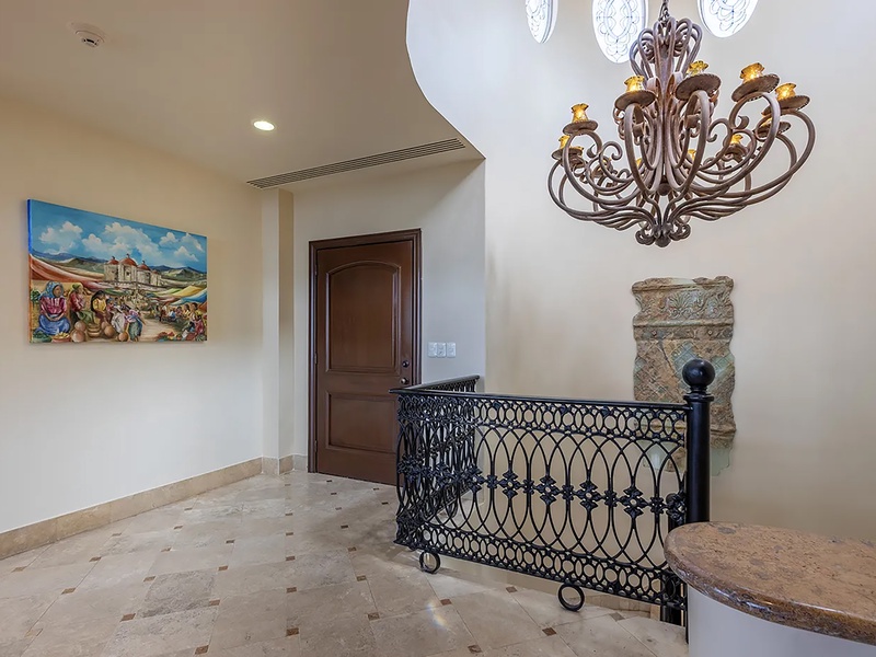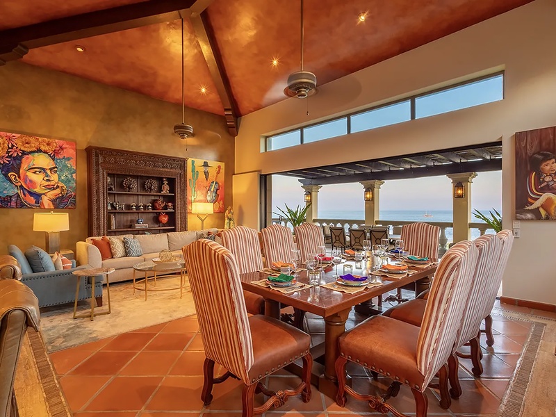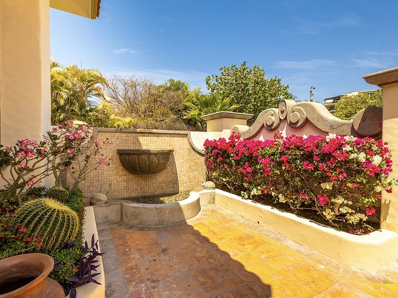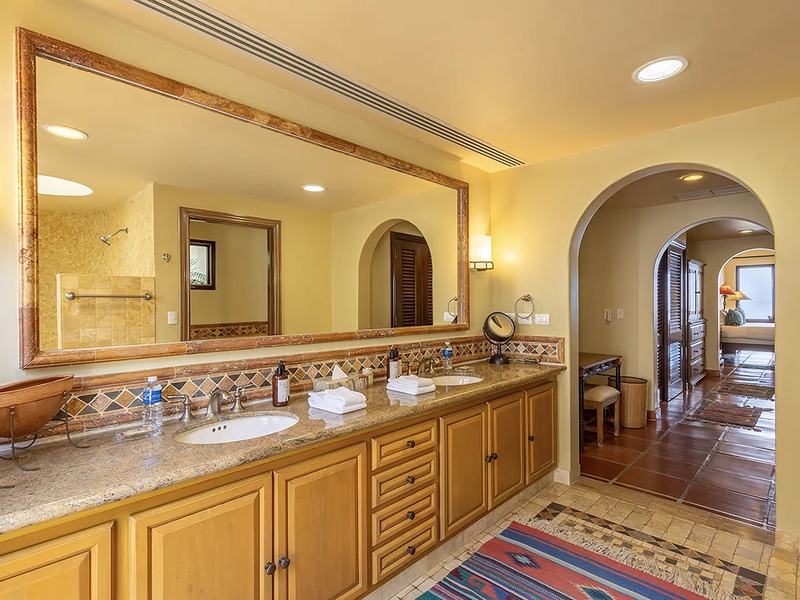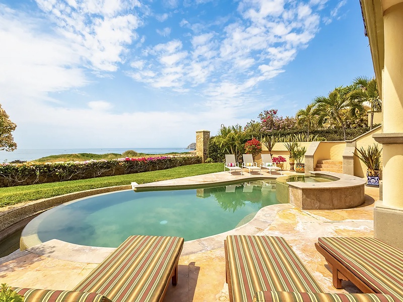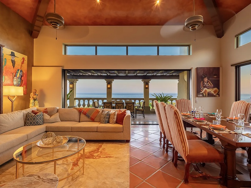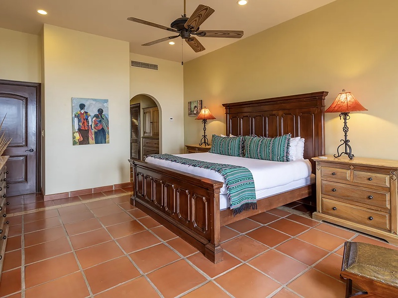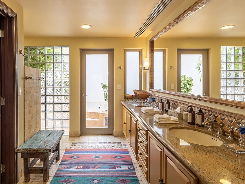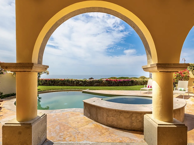 This oceanfront three-bedroom villa offers a peaceful retreat in one of Los Cabos’ most exclusive communities. Designed with timeless Hacienda-style charm, the home features warm wooden furnishings, colorful accents, and an inviting atmosphere throughout. Each of the three spacious bedrooms includes a private ensuite bathroom with both a shower and a tub—two with king-size beds and one with two full beds—ideal for families or groups of friends.