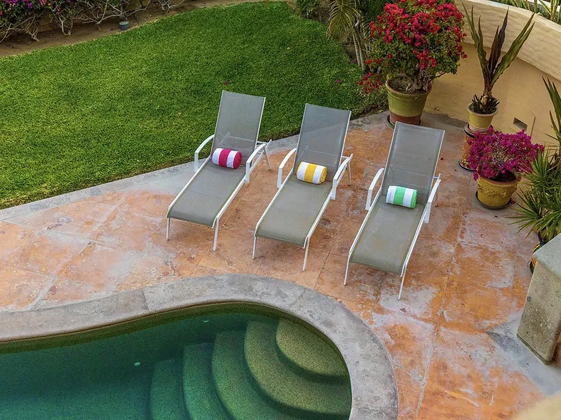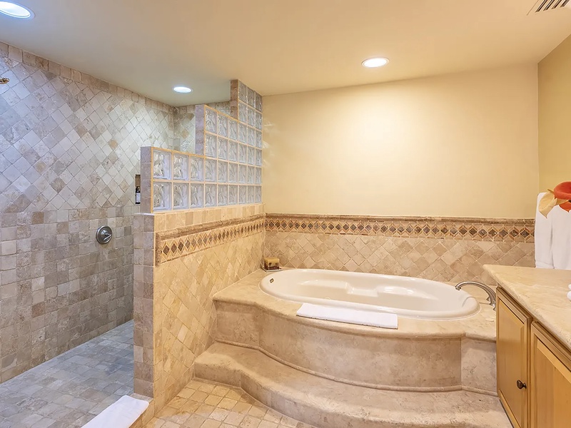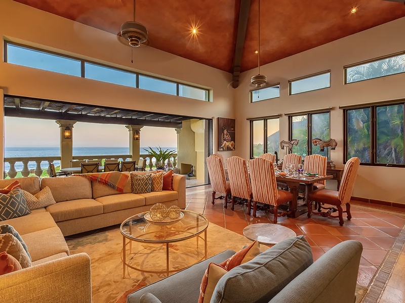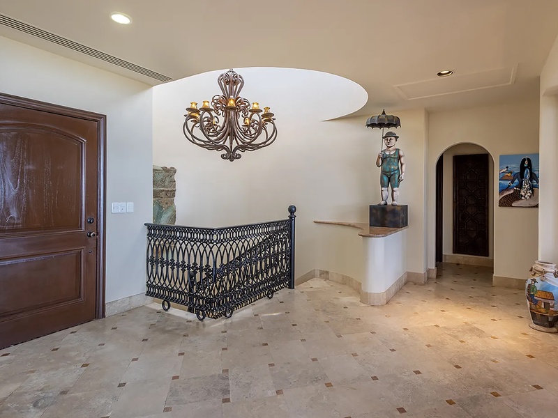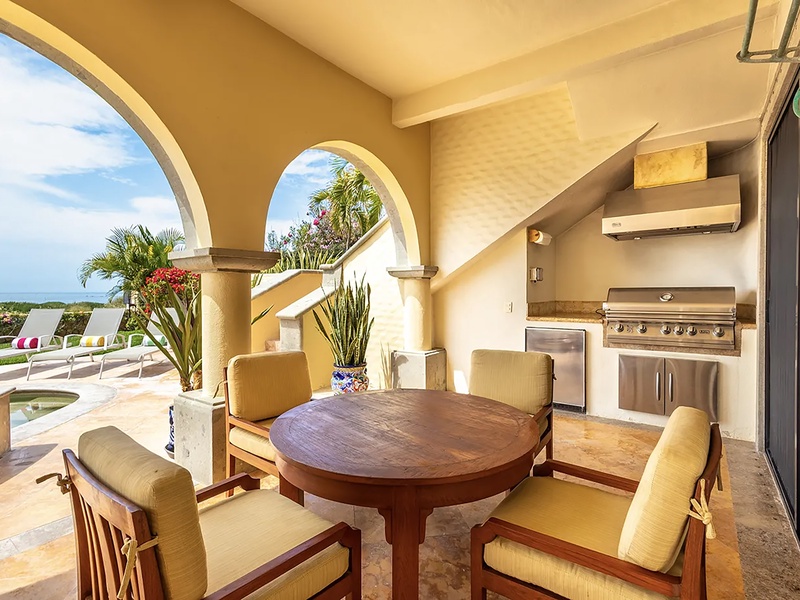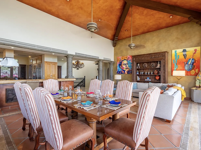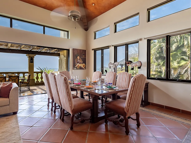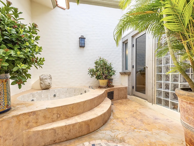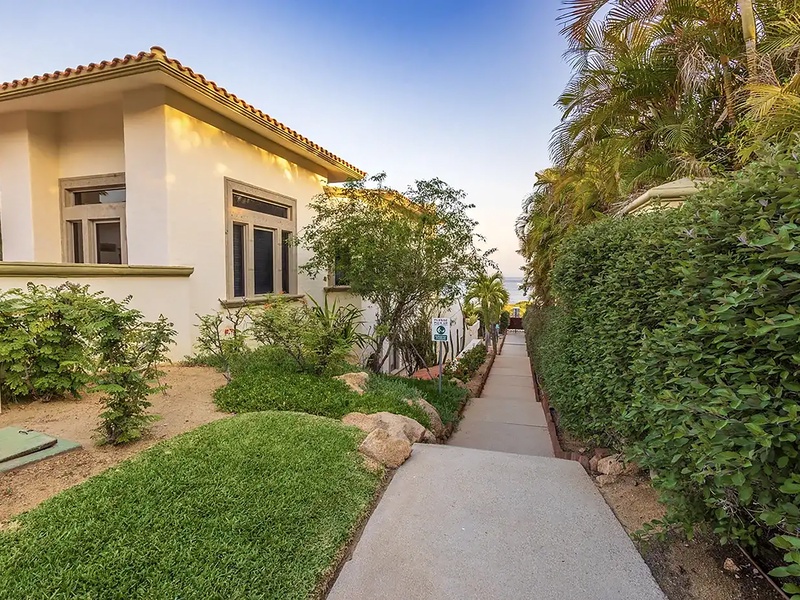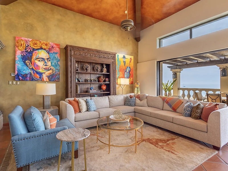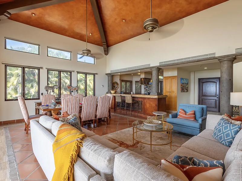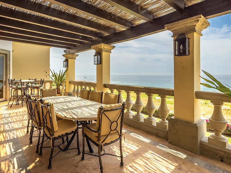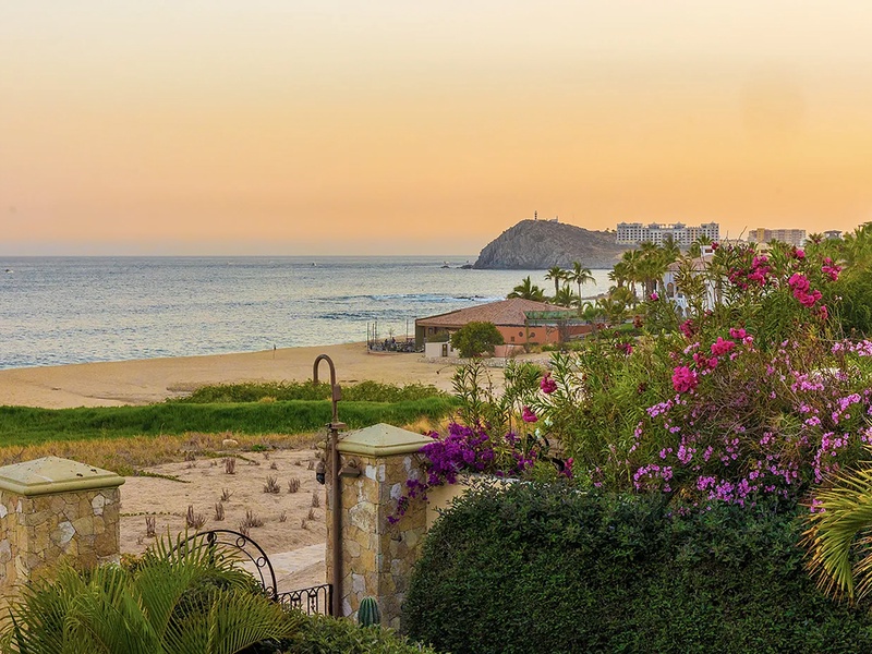 This oceanfront three-bedroom villa offers a peaceful retreat in one of Los Cabos’ most exclusive communities. Designed with timeless Hacienda-style charm, the home features warm wooden furnishings, colorful accents, and an inviting atmosphere throughout. Each of the three spacious bedrooms includes a private ensuite bathroom with both a shower and a tub—two with king-size beds and one with two full beds—ideal for families or groups of friends.